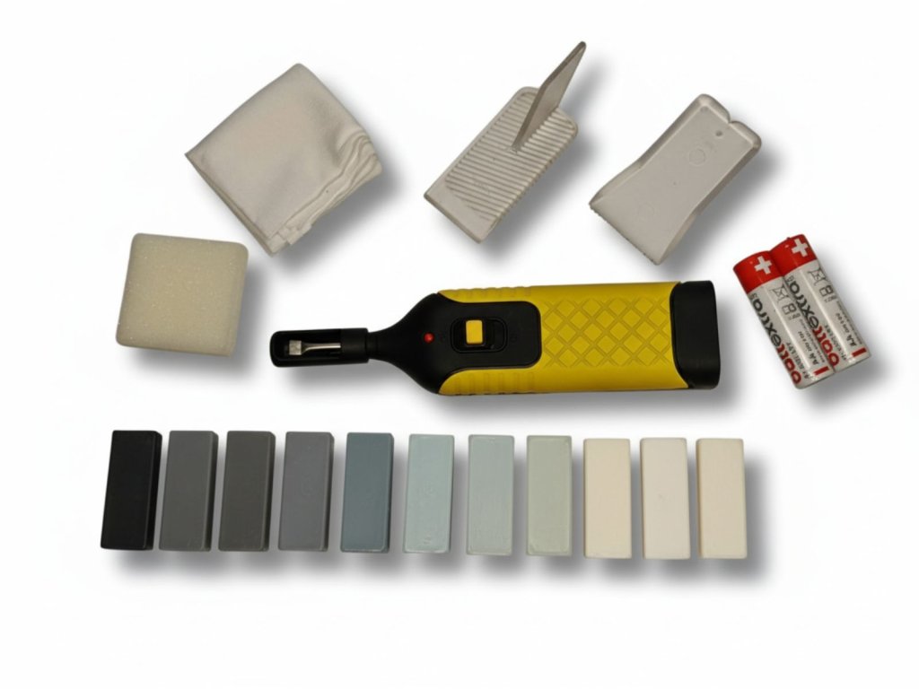 Hlubší škrábance nejprve vyhladíme pomocí přiložené plastové špachtle ve směru napříč ke škrábanci. Tím odstraníme nerovnosti a přebytky. Následně škrábance přebrousíme šedou brusnou vlnou, případně dočistíme jemnější bílým brusným filcem. Škrábance by neměly být po přebroušení vidět. Závěrem jemný prach setřeme navlhčeným bílým hadříkem.