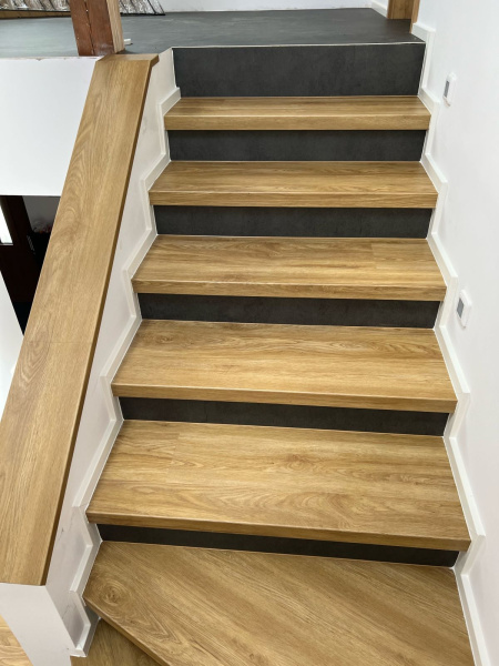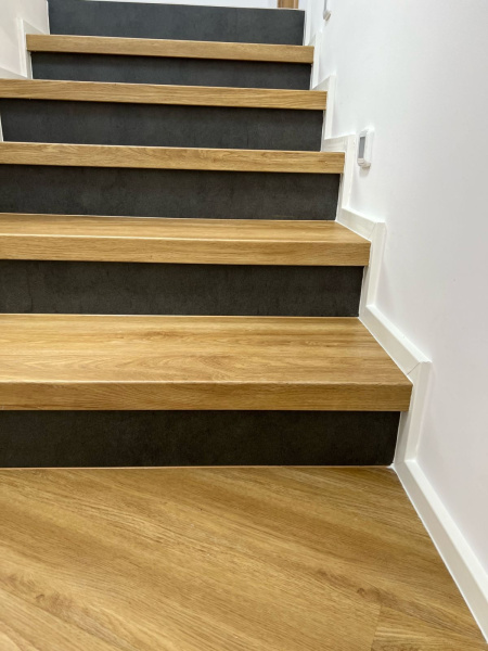 Ukázka práce podlahářů z Bukomy, obklad schodiště vinylovou podlahou BUKOMA PREMIUM U-CLICK dekor Dub Gladstone Hnědý, varianta schodů s nosem.