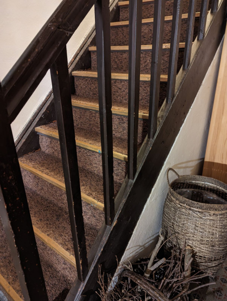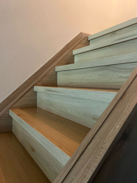Pro tento projekt jsme zvolili variantu schodů s nosem, která zajišťuje nejen estetický efekt, ale i vyšší bezpečnost při chůzi. Na obklad jsme použili ohnuté dílce vinylové podlahy bez nutnosti kovových lišt, což umožnilo dosáhnout hladkého, elegantního přechodu mezi schodnicemi a podstupnicemi a zcela tak eliminovat ostré hrany či rušivé spoje. Přidali jsme i olepení soklů a bočnic schodiště. Takto provedený obklad schodiště působí jednolitě a přirozeně ladí s celým interiérem.