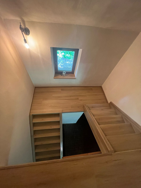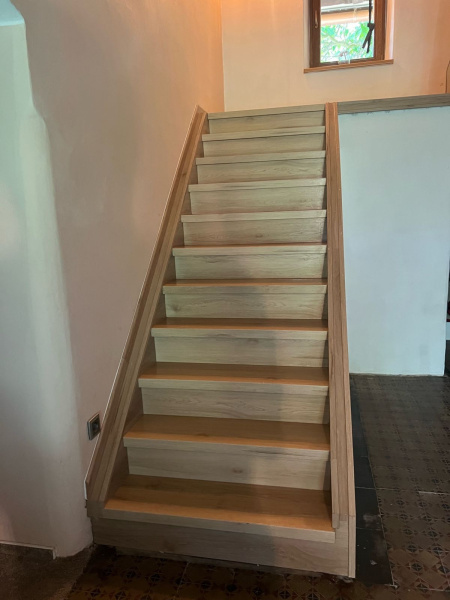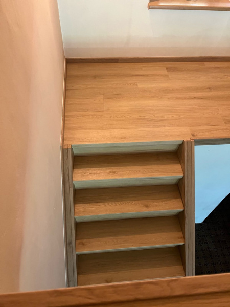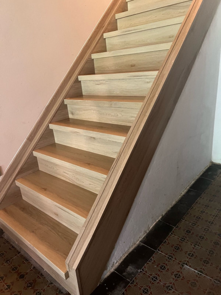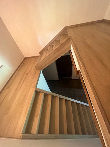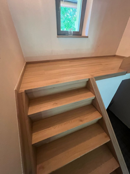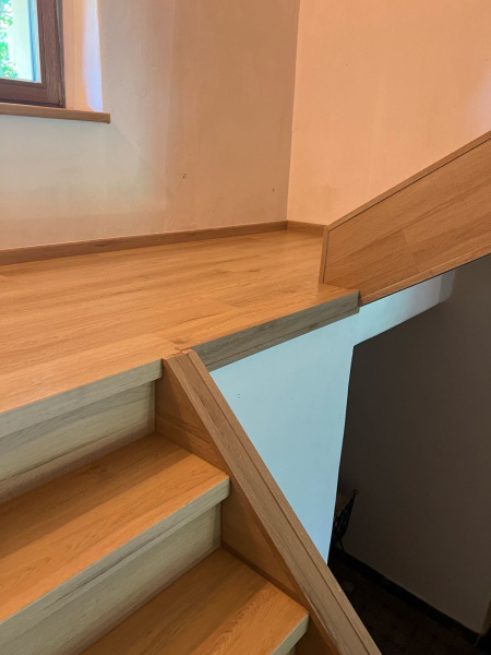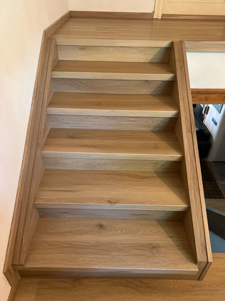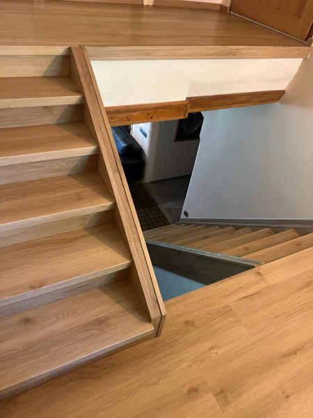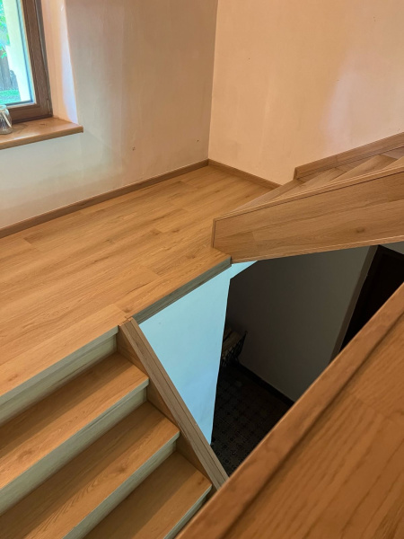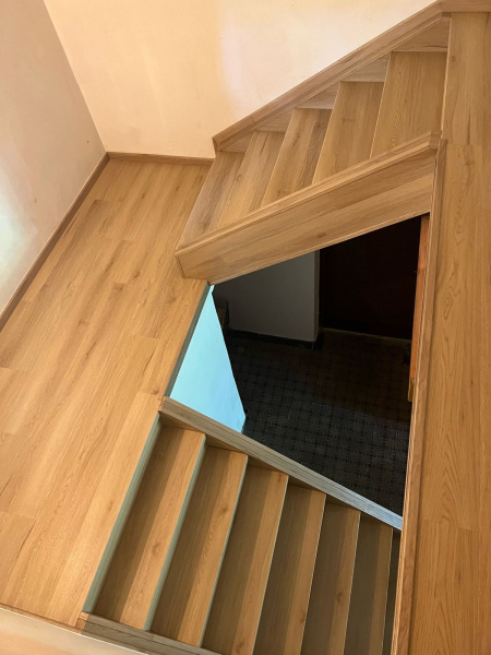 Představujeme realizaci obkladu schodiště podlahářů z Bukomy, kde byla použita kvalitní vinylová podlaha BUKOMA PREMIUM CLICK XL v dekoru Dub Natur. Tato realizace proběhla v obci Dolní Loučky u Krnova na Severní Moravě a původní schodiště bylo pokryto kobercem, který jsme nahradili moderním a odolným vinylovým materiálem. Výsledkem je schodiště s nadčasovým dřevěným vzhledem a vysokou funkčností.
