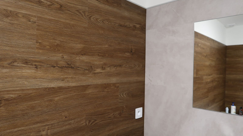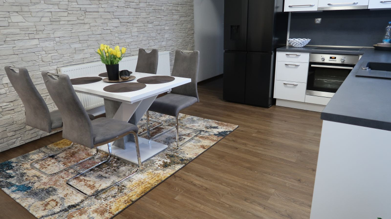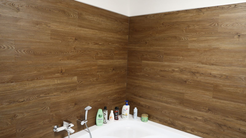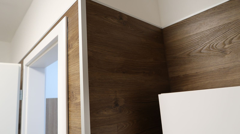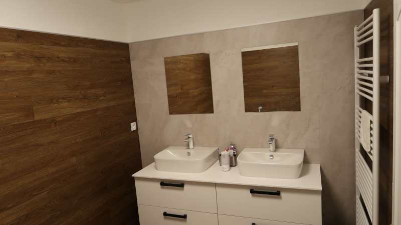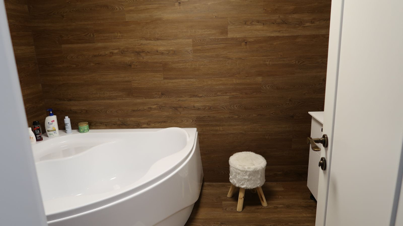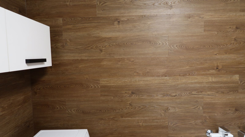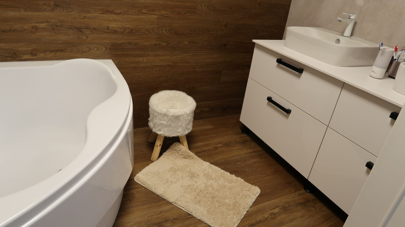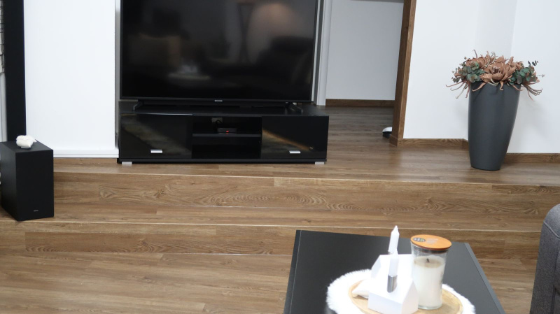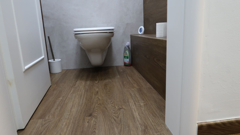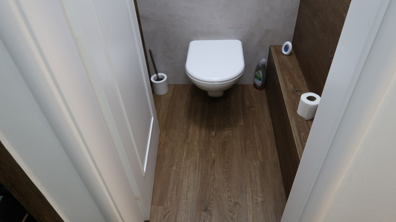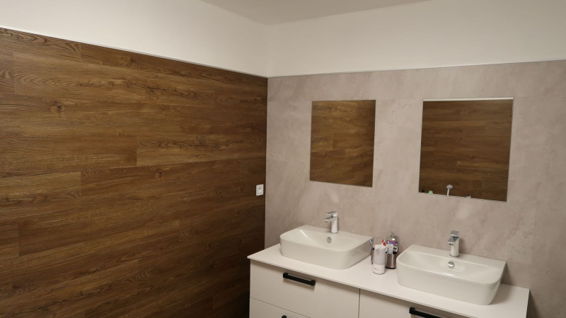 Pokládka byla provedena precizně, aby jednotlivé dílce perfektně navazovaly a vytvářely jednolitý povrch bez rušivých přechodů. Výsledkem je interiér s moderním a čistým vzhledem, který působí elegantně a vysoce prakticky. Vinylový obklad v koupelně zase dodává prostoru stylový nádech a zároveň zajišťuje voděodolnost, což je klíčové pro zachování hygieny a estetiky v tomto typu místností.