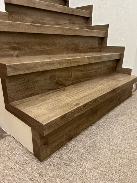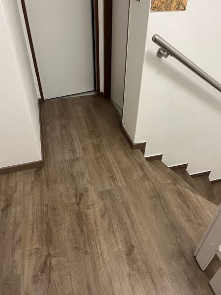 Další ukázka naši práce - obklad schodiště vinylovou podlahou BUKOMA PREMIUM U-CLICK XL Dub Barflod. Varianta schodů s nosem.