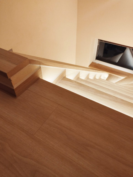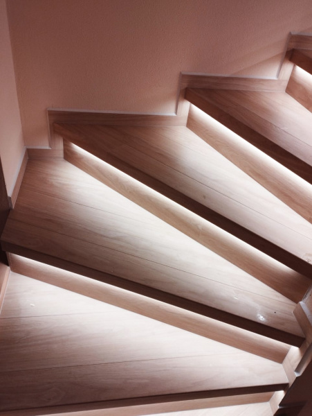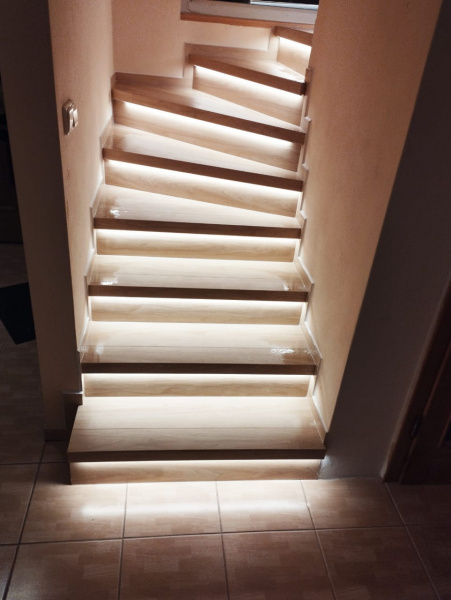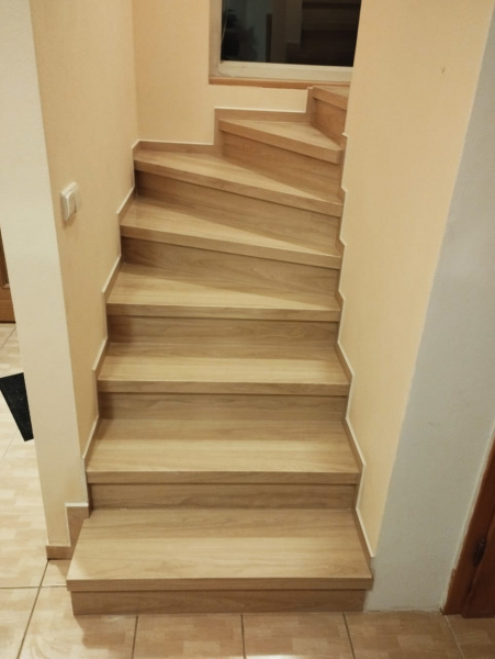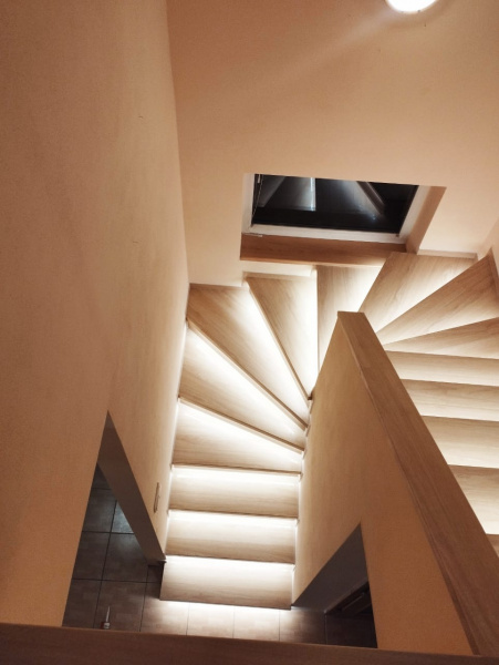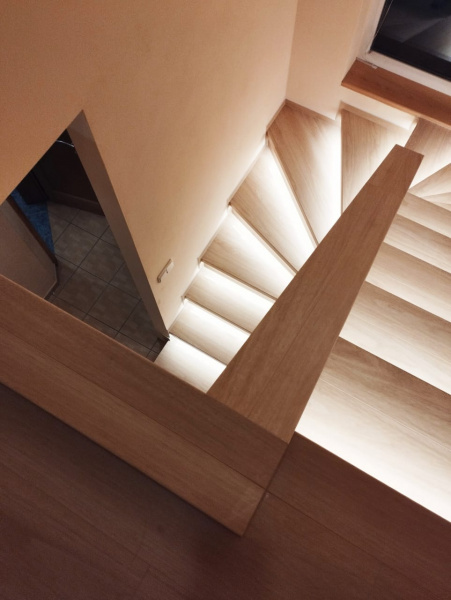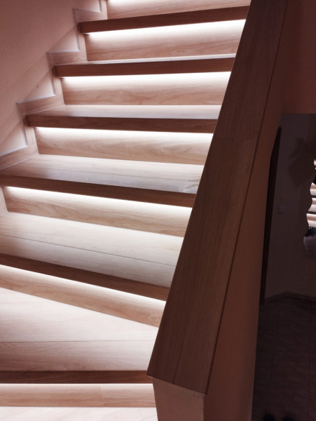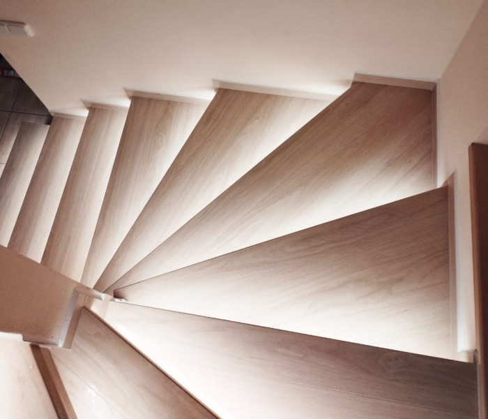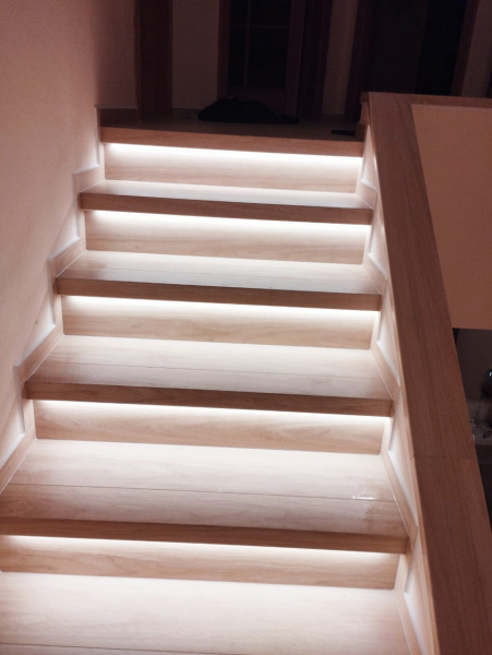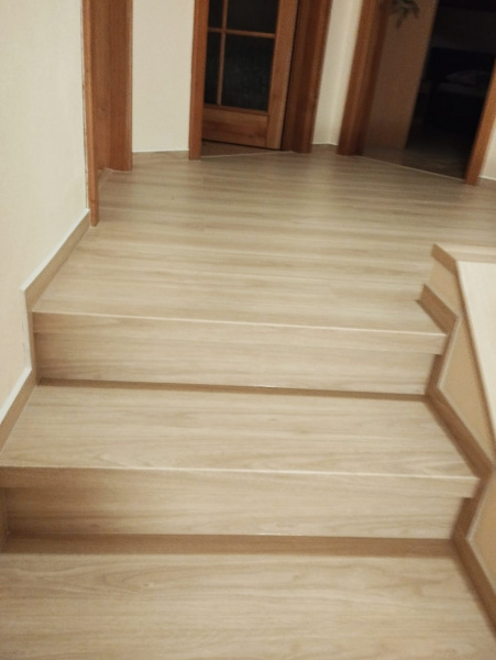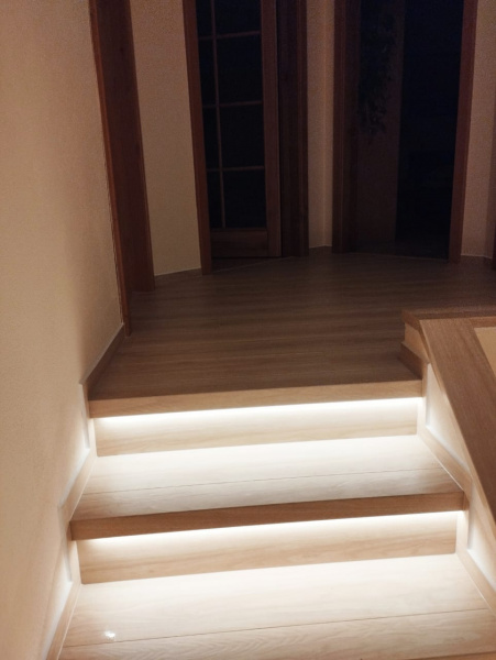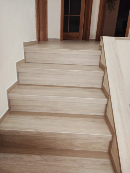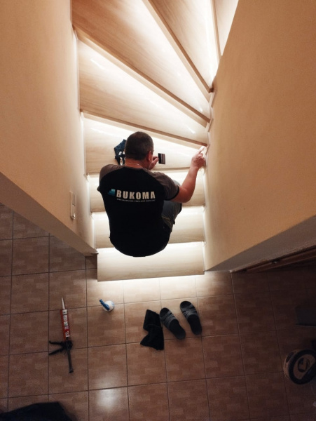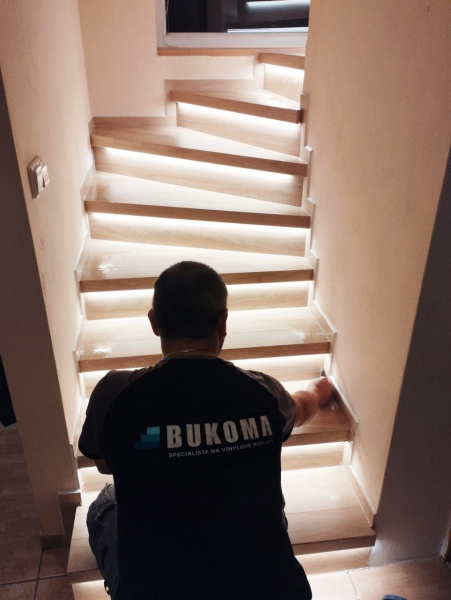 Další ukázka práce podlahářů z Bukomy, obklad schodiště vinylovou podlahou BUKOMA CLICK Dub Zlatý, varianta schodů s nosem + osvětlení LED pásky.