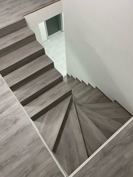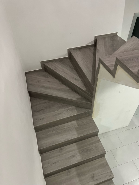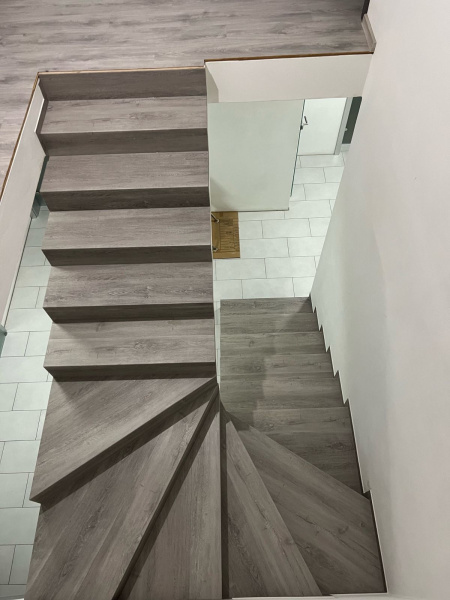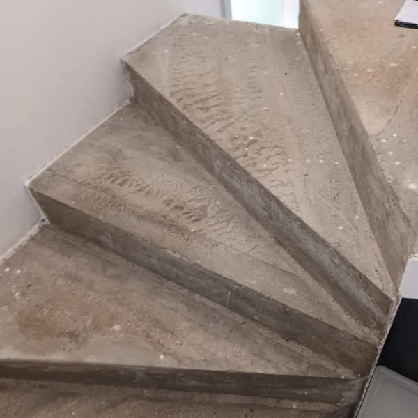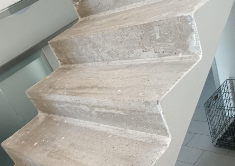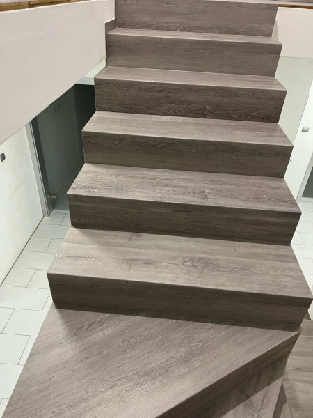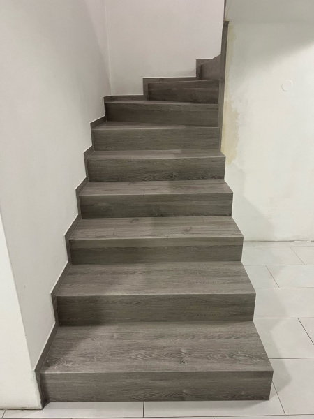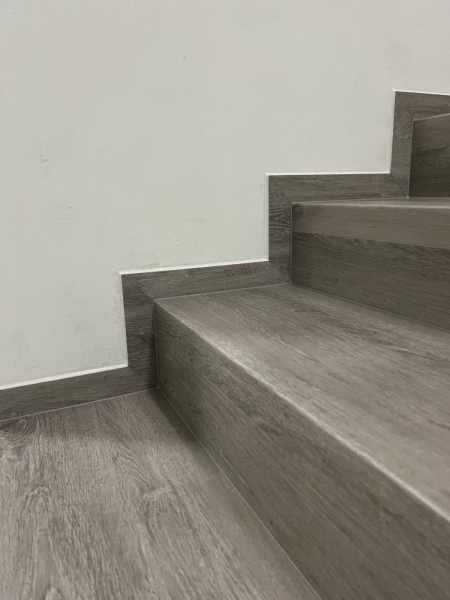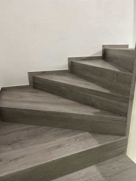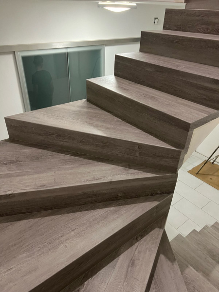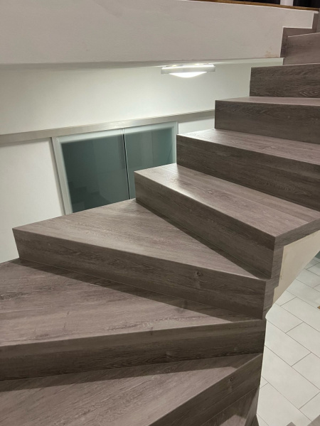 V této realizaci jsme obkládali betonový monolit, což zajišťuje stabilní a pevný podklad pro schody. Zvolili jsme variantu bez nosu, která schodišti dodává hladký a minimalistický vzhled, ideální pro moderní interiéry.