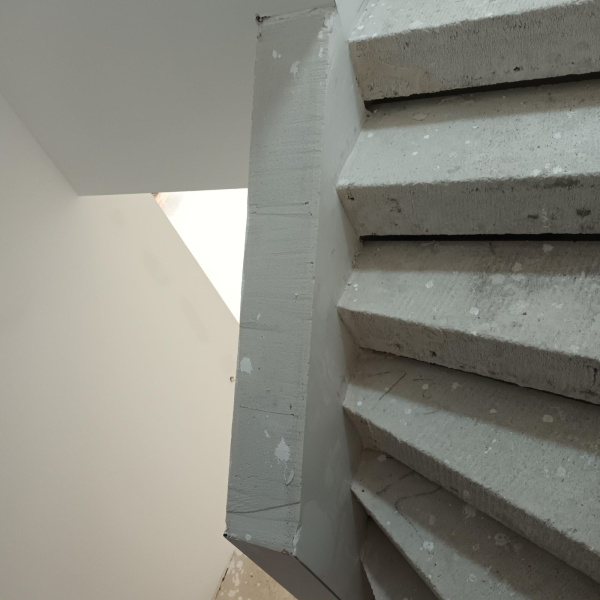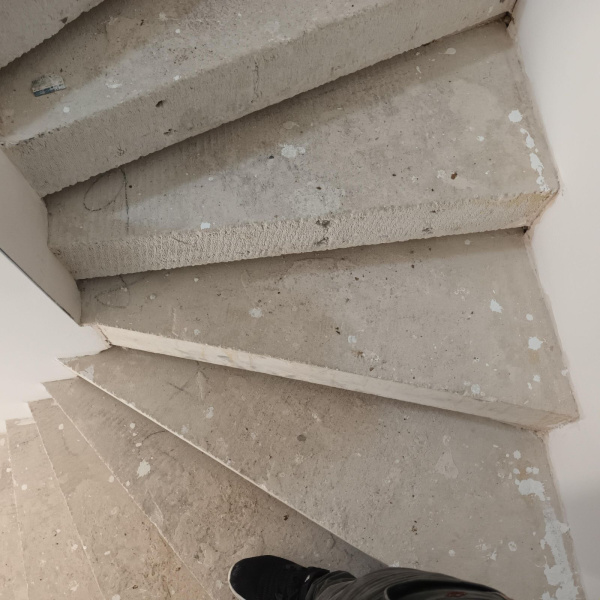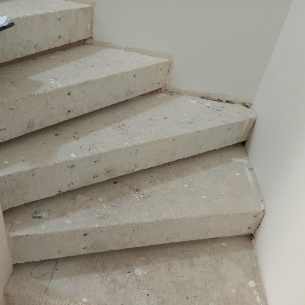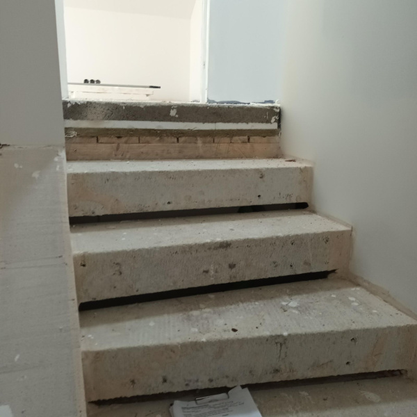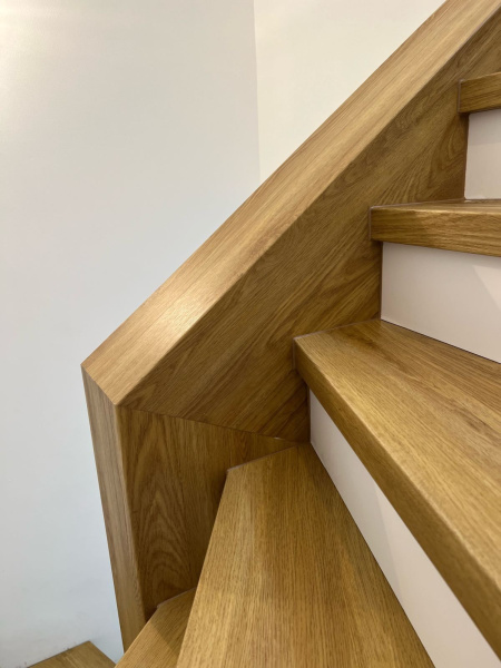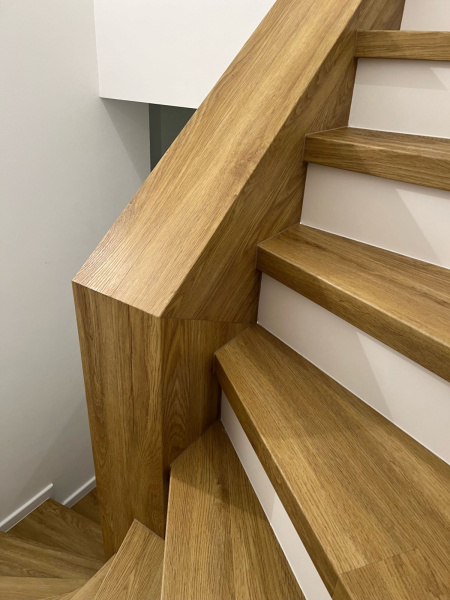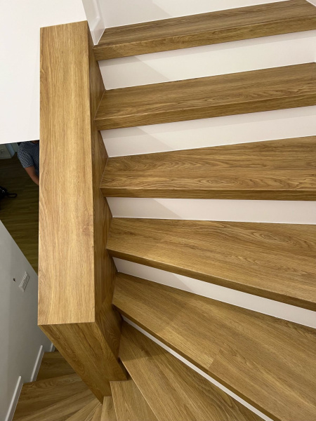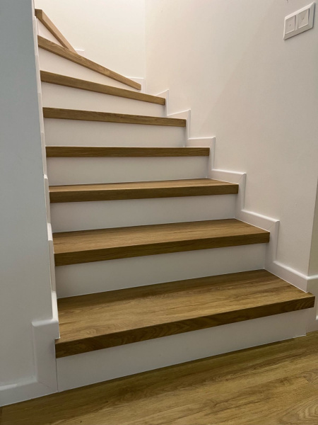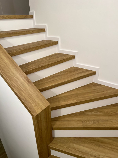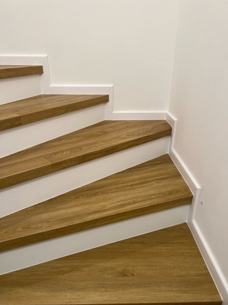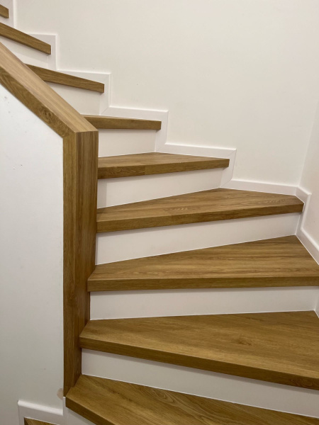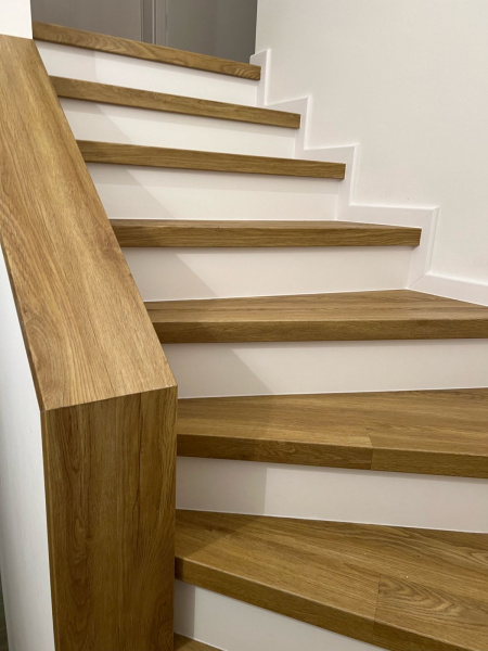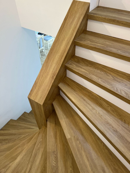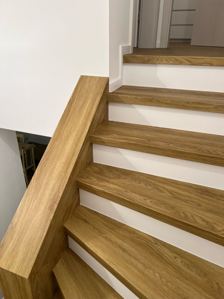 Ukázka práce podlahářů z Bukomy, obklad schodiště vinylovou podlahou BUKOMA PREMIUM U-CLICK dekor Dub Gladstone Hnědý, varianta schodů s nosem a bílými podstupnicemi. Obklad zídky zábradlí je proveden taktéž vinylovou podlahou ve stejném dekoru.