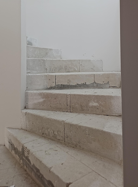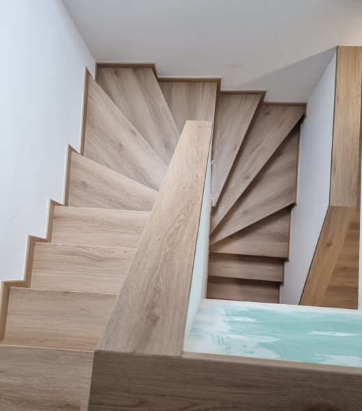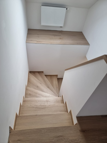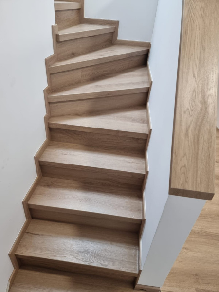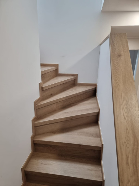 Výchozím podkladem bylo ytongové schodiště, které jsme precizně připravili na pokládku. Vinylová podlaha s ohyby je ideální volbou pro schodiště, protože zajišťuje vysokou odolnost, snadnou údržbu a příjemný povrch pro každodenní použití.