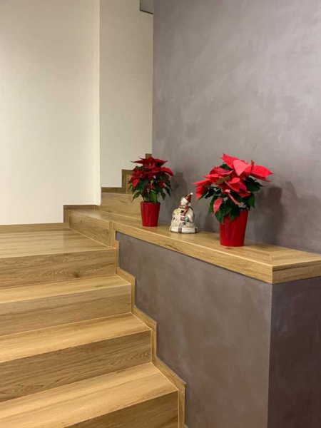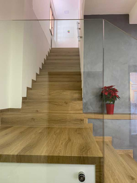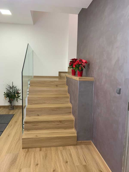 Tento obklad schodiště včetně pokládky podlahy v celém domě je ukázkou práce podlahářů z Bukomy. Použitá vinylová podlaha je BUKOMA PREMIUM CLICK XL dekor Dub Bunbury
