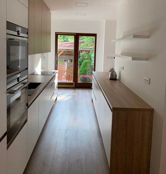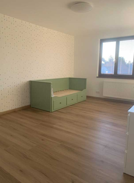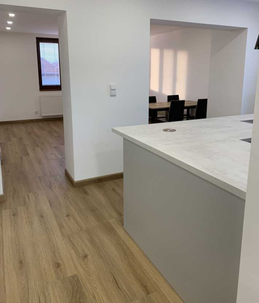 Podlahy jsou položeny bez přechodových lišt mezi místnostmi.