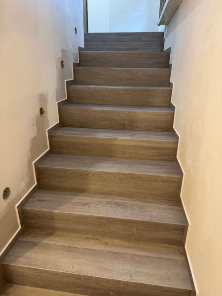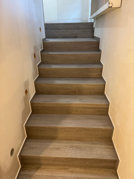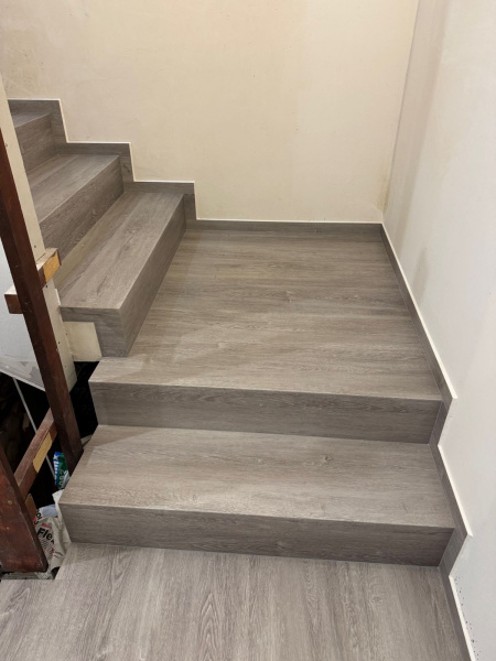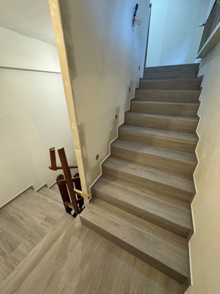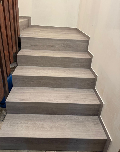 Pro obklad schodiště jsme zvolili špičkovou vinylovou podlahu BUKOMA PREMIUM U-CLICK XL Dub Bright, která díky svému světlému dekoru dřeva přináší prostoru svěžest a příjemnou atmosféru. Výjimečnost této realizace spočívá v detailech – schody jsou provedeny bez nosu, což jim dodává čistý a minimalistický vzhled. Vinylový povrch byl pečlivě přizpůsoben každému ohybu a hranu, což zajišťuje perfektní provedení i dlouhou životnost.