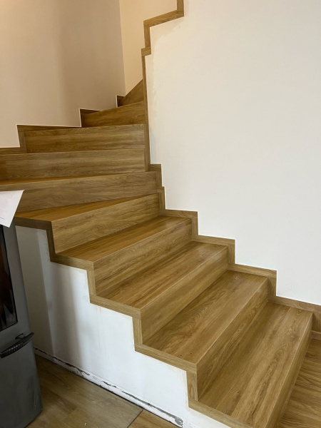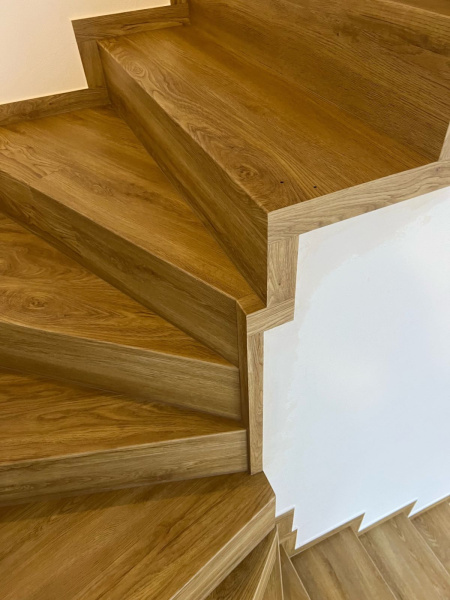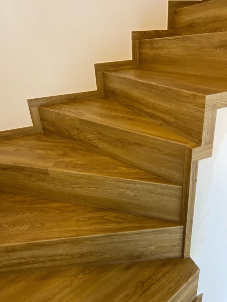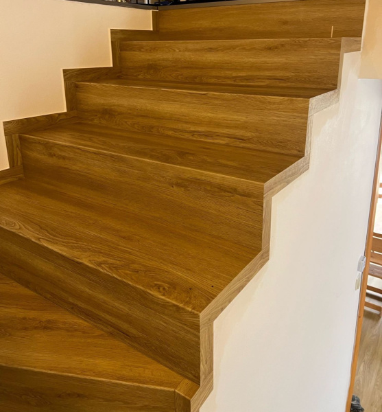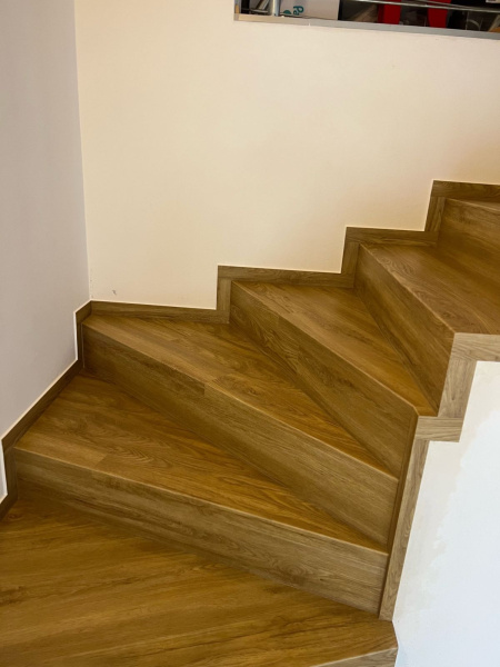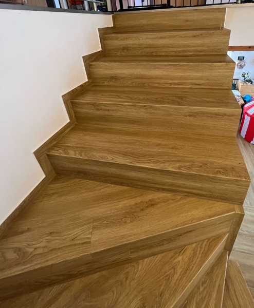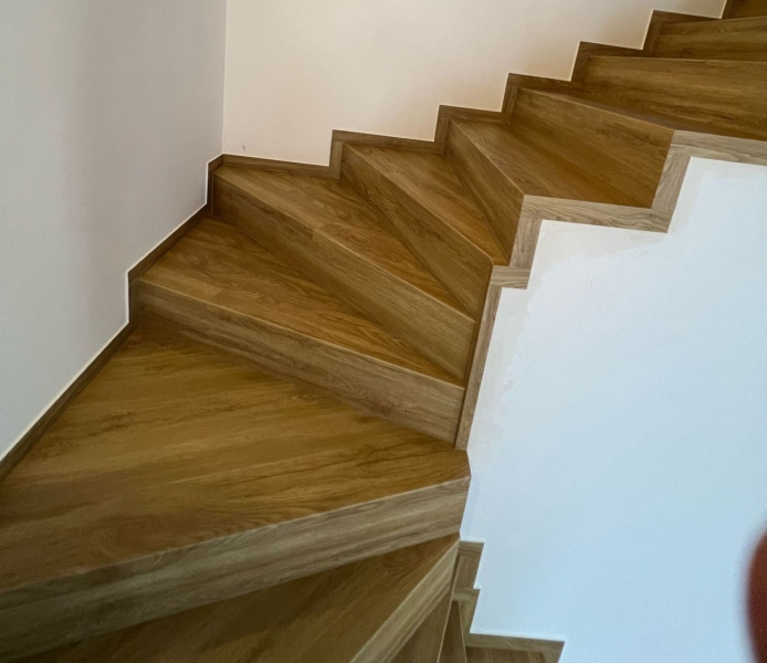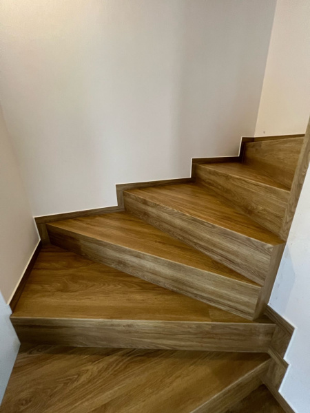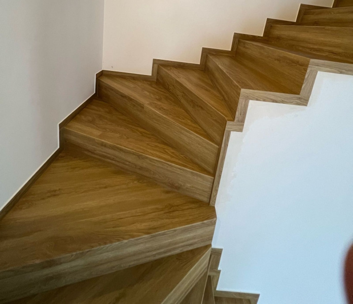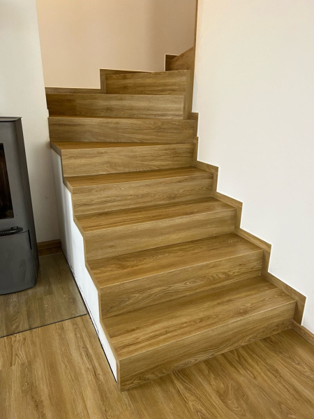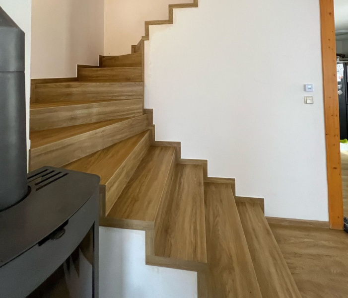Ukázka práce podlahářů z Bukoma, obklad schodiště vinylovou podlahou BUKOMA PREMIUM U-CLICK Dub Gladstone hnědý, varianta schodů bez nosu.