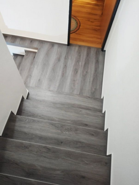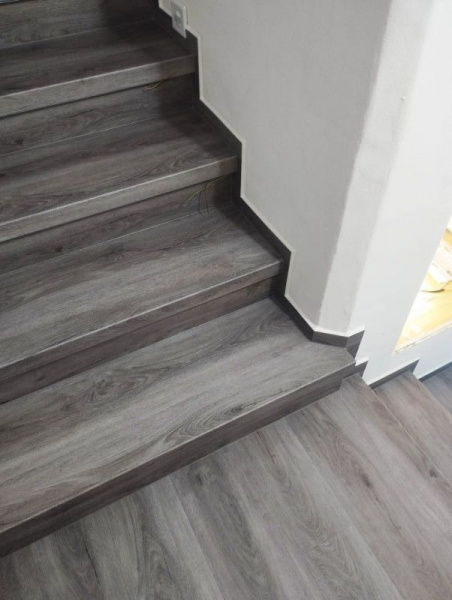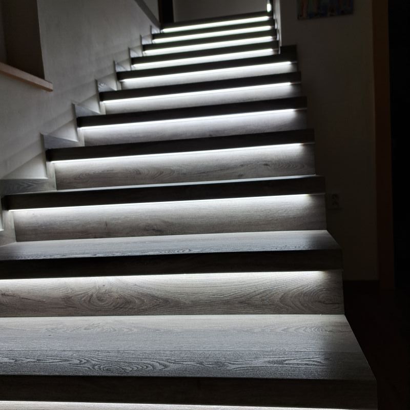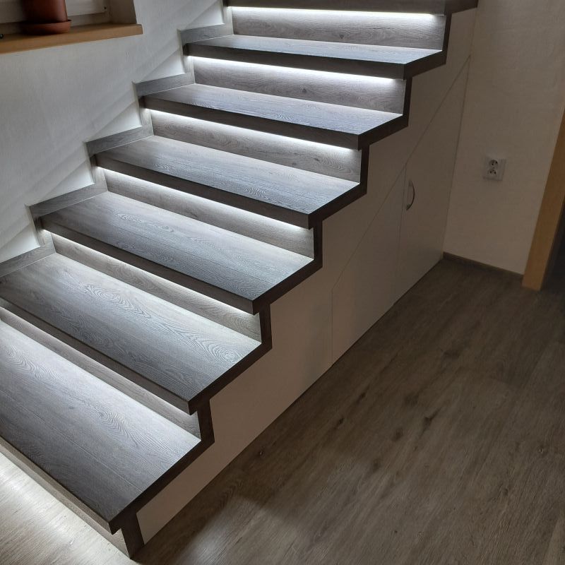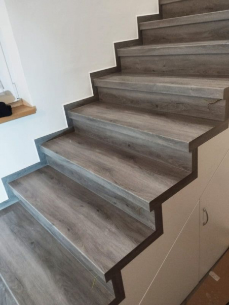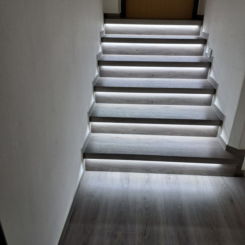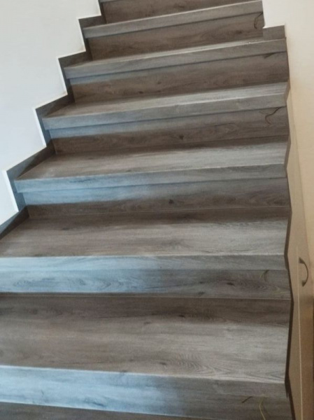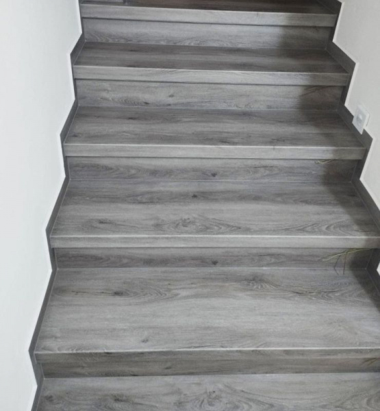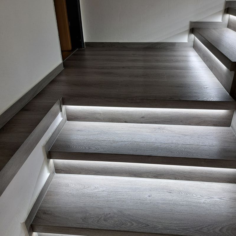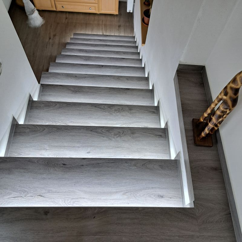 Další ukázka naši práce - obklad schodiště vinylovou podlahou BUKOMA PREMIUM U-CLICK Dub Legend Šedý. Varianta schodů s nosem a LED osvětlením.