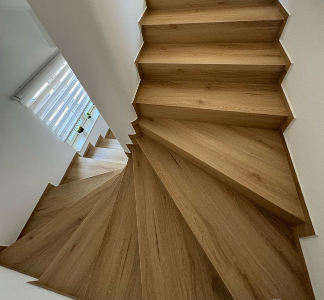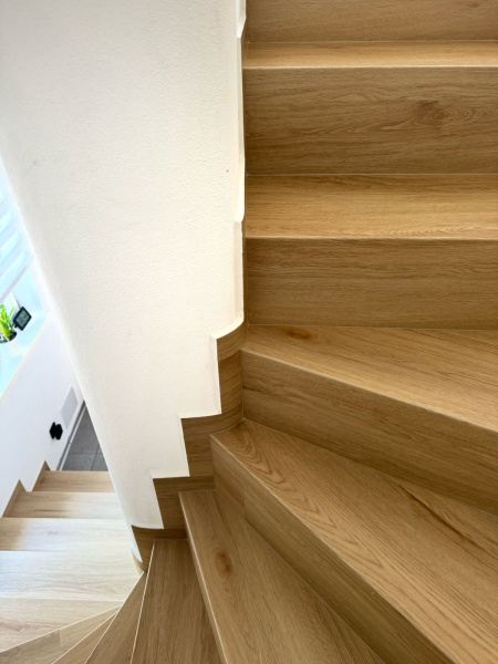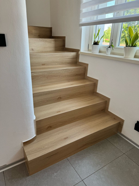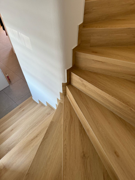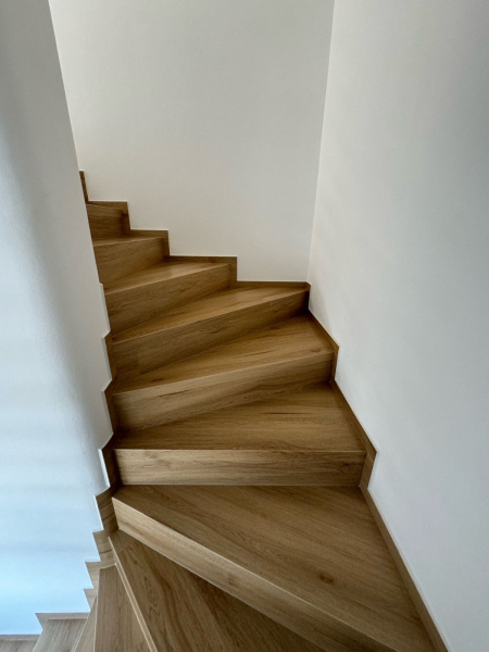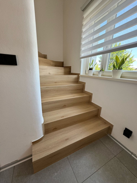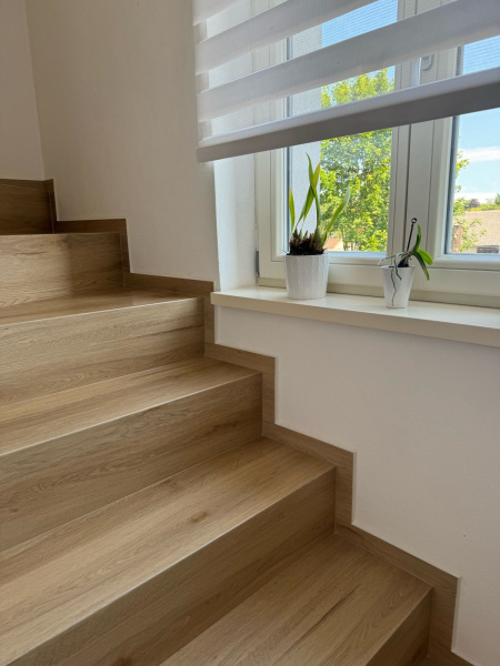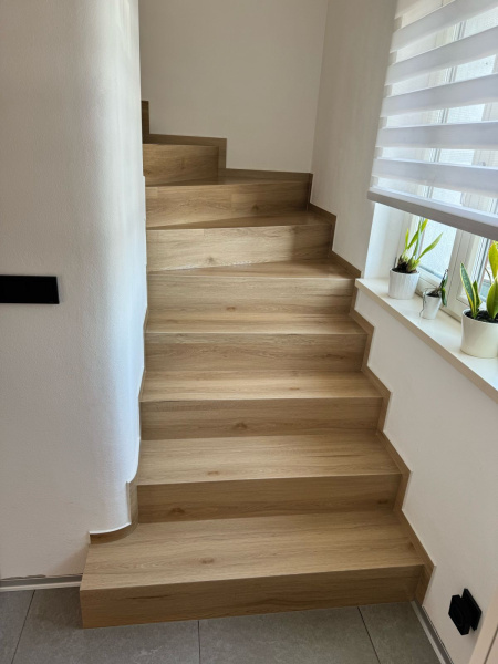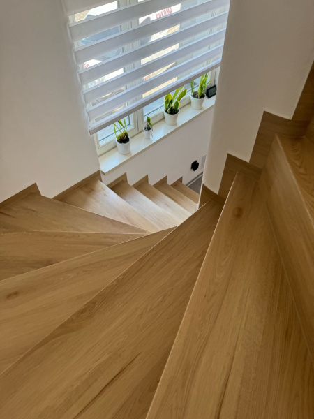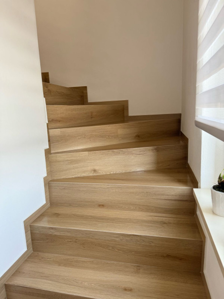 Pro tuto realizaci jsme zvolili variantu schodů bez nosu, která vytváří čistý, moderní vzhled. Tento design zajišťuje, že schodiště působí vzdušně a otevřeně, což opticky zvětšuje prostor. Detaily jsou kladeny na první místo – každý schod je precizně obložený, aby vytvořil harmonický a profesionální finiš. Výběr vinylové podlahy s dekorem Dub Natur LIght dodává prostoru svěží a přírodní charakter, který je v souladu s moderními trendy v designu.
