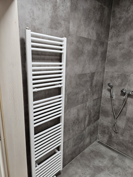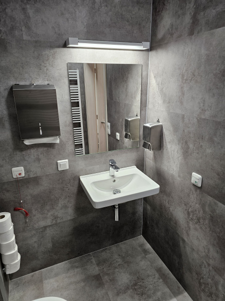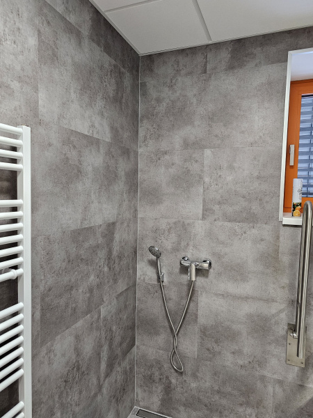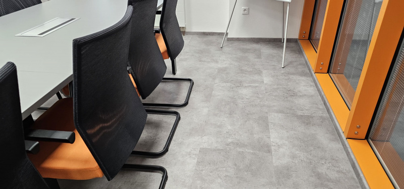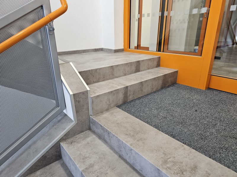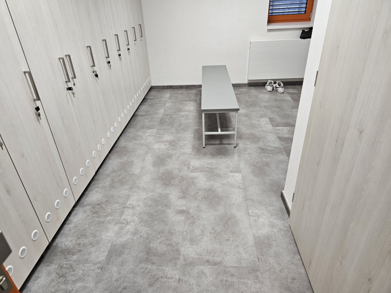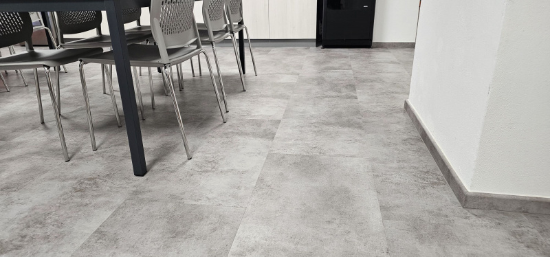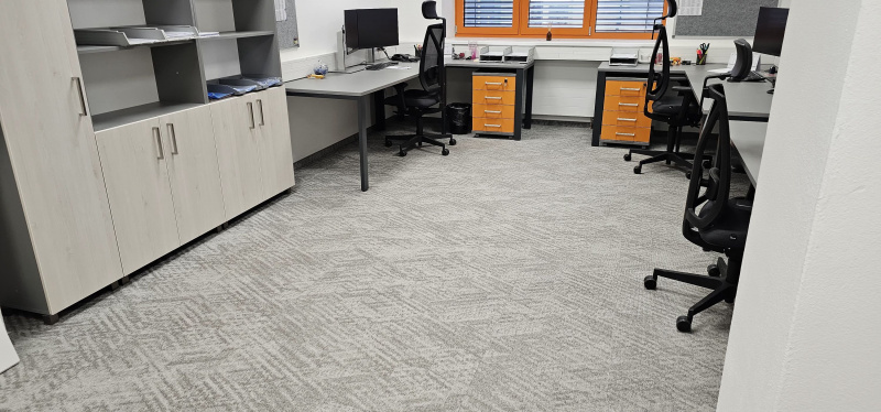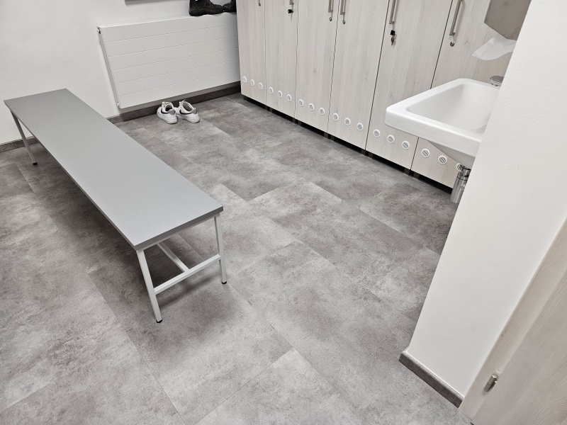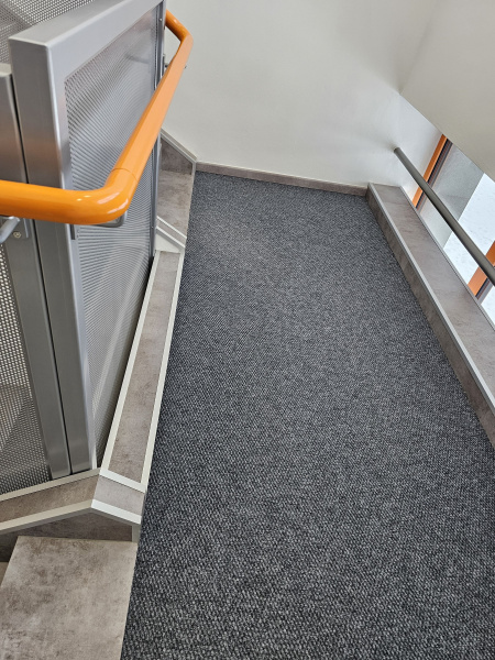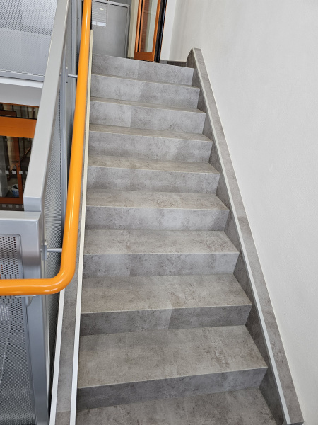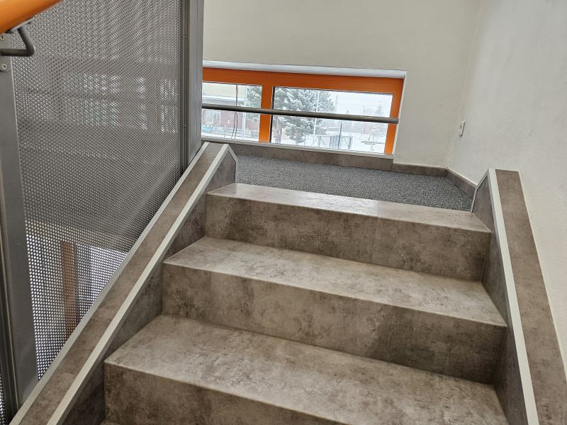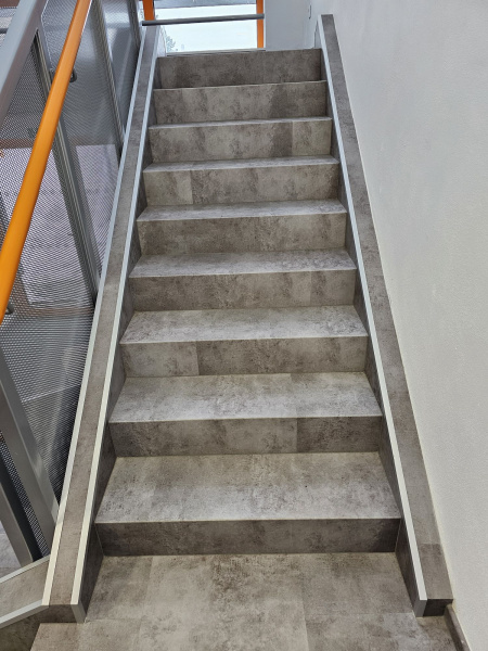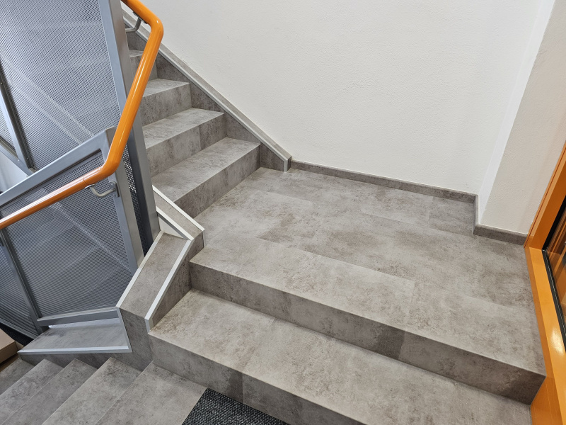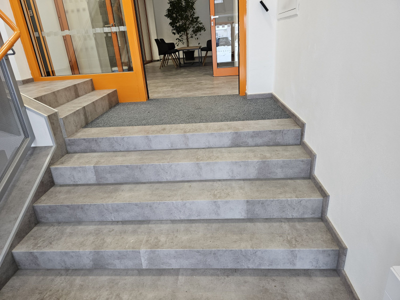 Ukázka jedné naši rozsáhlejší realizace - podlahy v nových prostorech firmy JIMI CZ s.r.o. ve Vyškově. Všechny použité vinylové podlahy jsou z naši nabídky, produktová řada BUKOMA STONE CLICK XL. Mimo schodů jsme obkládali i toalety vč. sprchových koutů. Většina podlahových ploch je z vinylových plovoucích podlah, na podestách schodišť jsme pak dávali čistící zóny a v kancelářích zátěžové koberce. Díky většímu počtu našich kmenových podlahářů jsme schopni řešit i větší zakázky v rekordních termínech s důrazem na kvalitu odvedené práce. Práce naše podlaháře baví, proto si vyhrají i s nejrůznějšími detaily tak, aby na svou práci mohli být právem hrdí. Podklady jsme často vyrovnávali nivelační stěrkou a prováděli precizní hydroizolaci ve sprchových koutech.