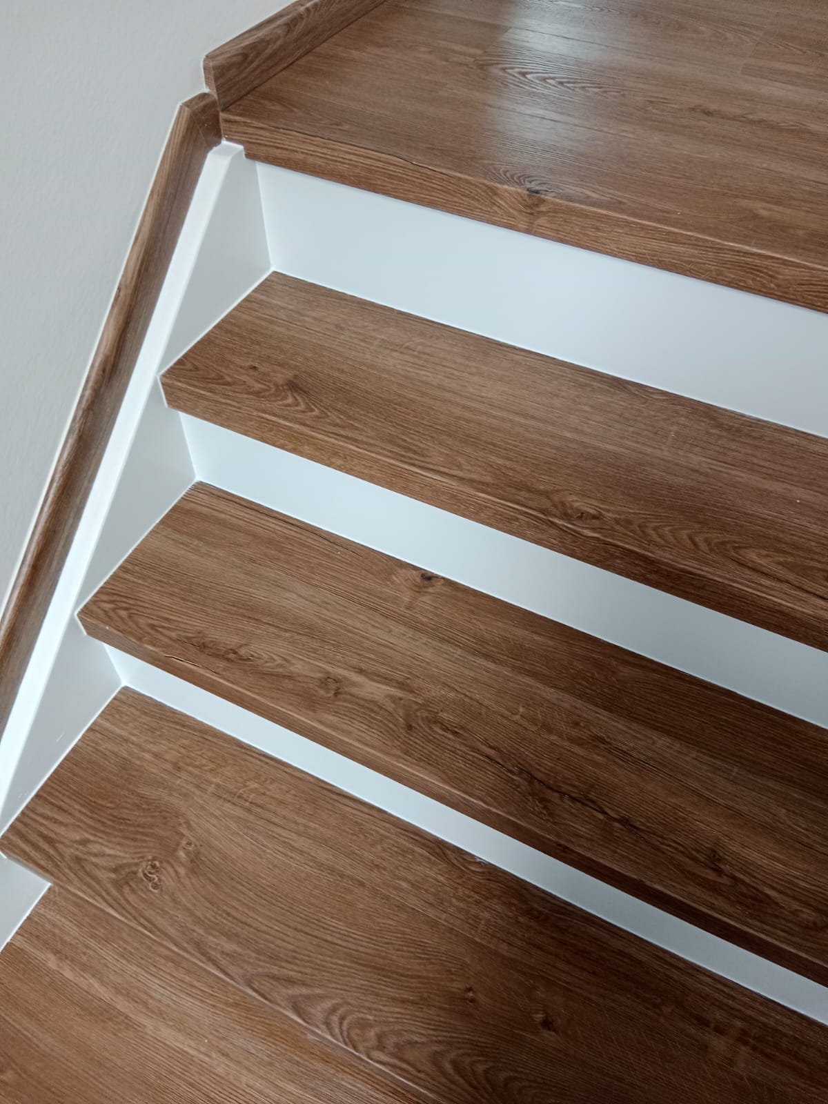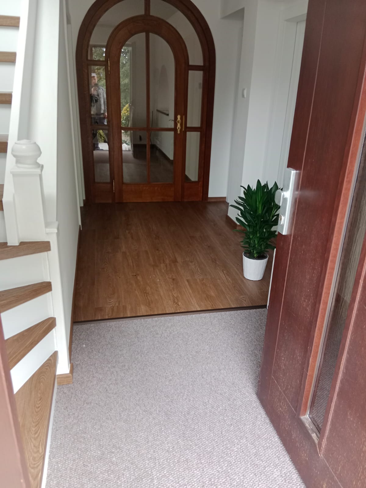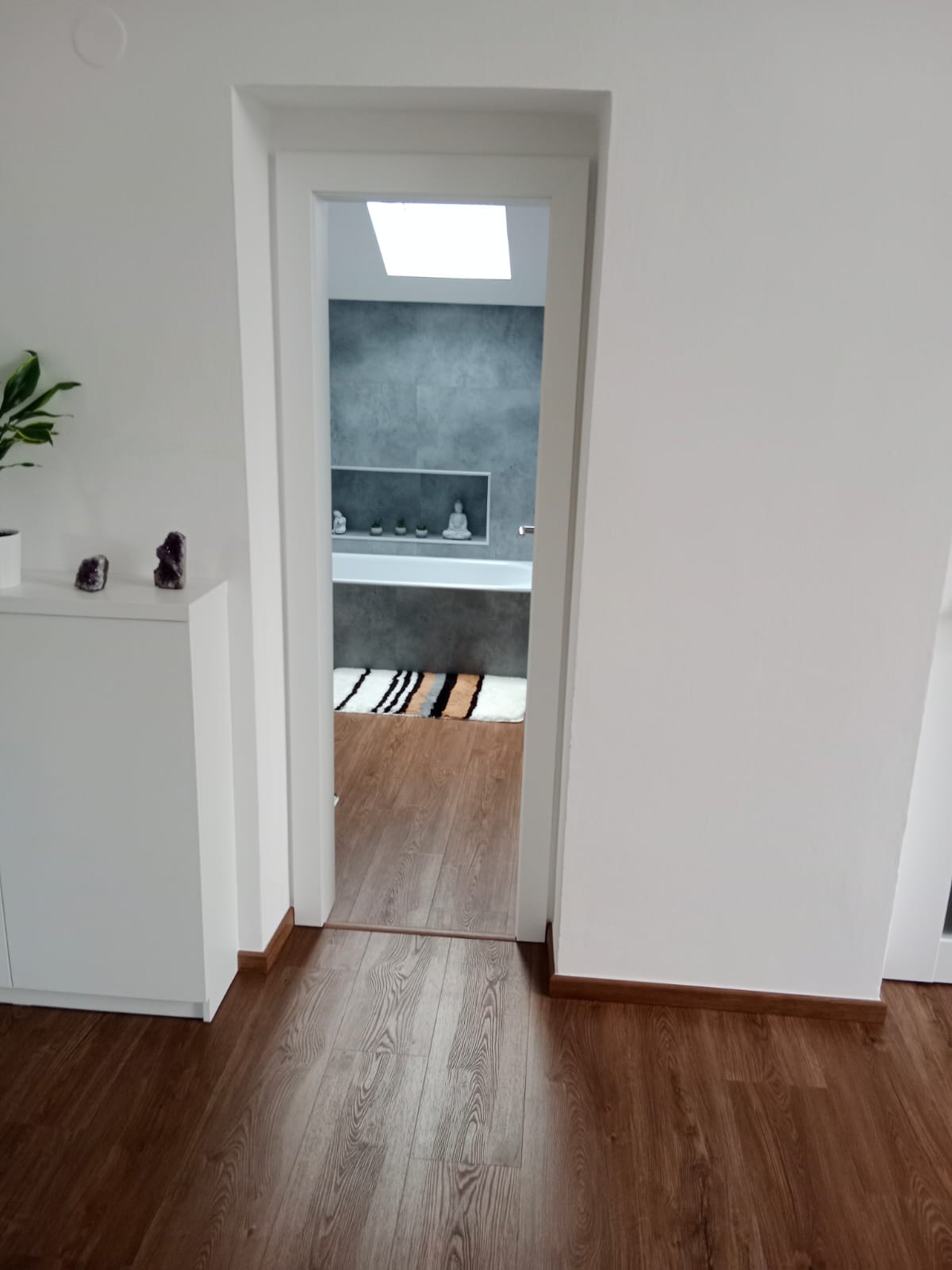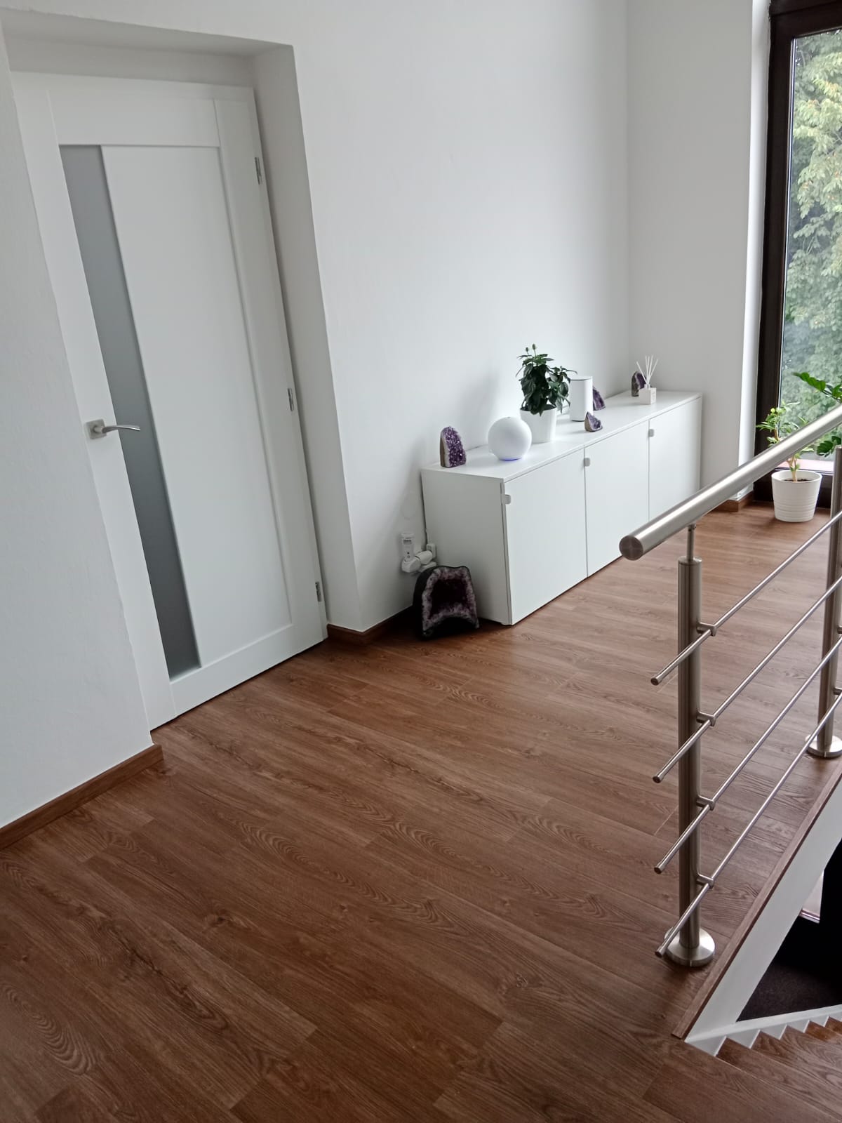 V rodinném domě v Ledči nad Sázavou jsme se podíleli na proměně designu celého domu, pomohli jsme s podlahami, obkladem schodiště i koupelny s toaletou do vinylu BUKOMA. Zákazník si vybral podlahu v dekoru BUKOMA PREMIUM U‑CLICK Dub Všechovický, který přináší autentickou kresbu dubu a odolný povrch pro každodenní provoz. Schodiště je realizováno se schody s nosem pro bezpečný došlap a čisté linie. Zakončení stěn zajišťují soklové lišty BUKOMA PROFI‑60 v přesném dekoru podlahy, díky čemuž je prostor vizuálně kompaktní a působí jednotně. Pro obklady zdí v koupelně a toaletě pak byla zvolena vinylová podlaha v dekoru BUKOMA STONE U-CLICK XL Beton Kámen Šedý
