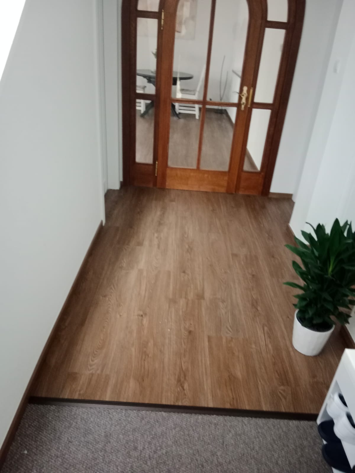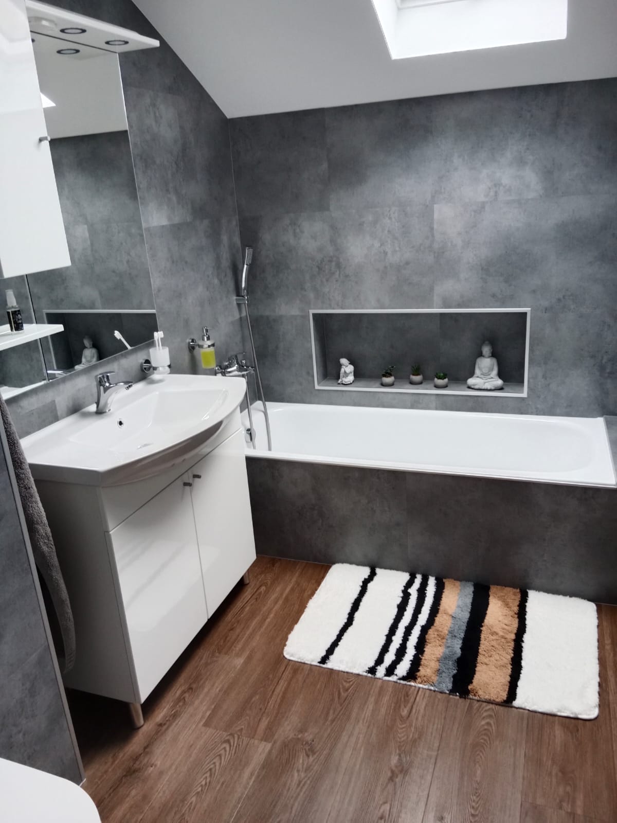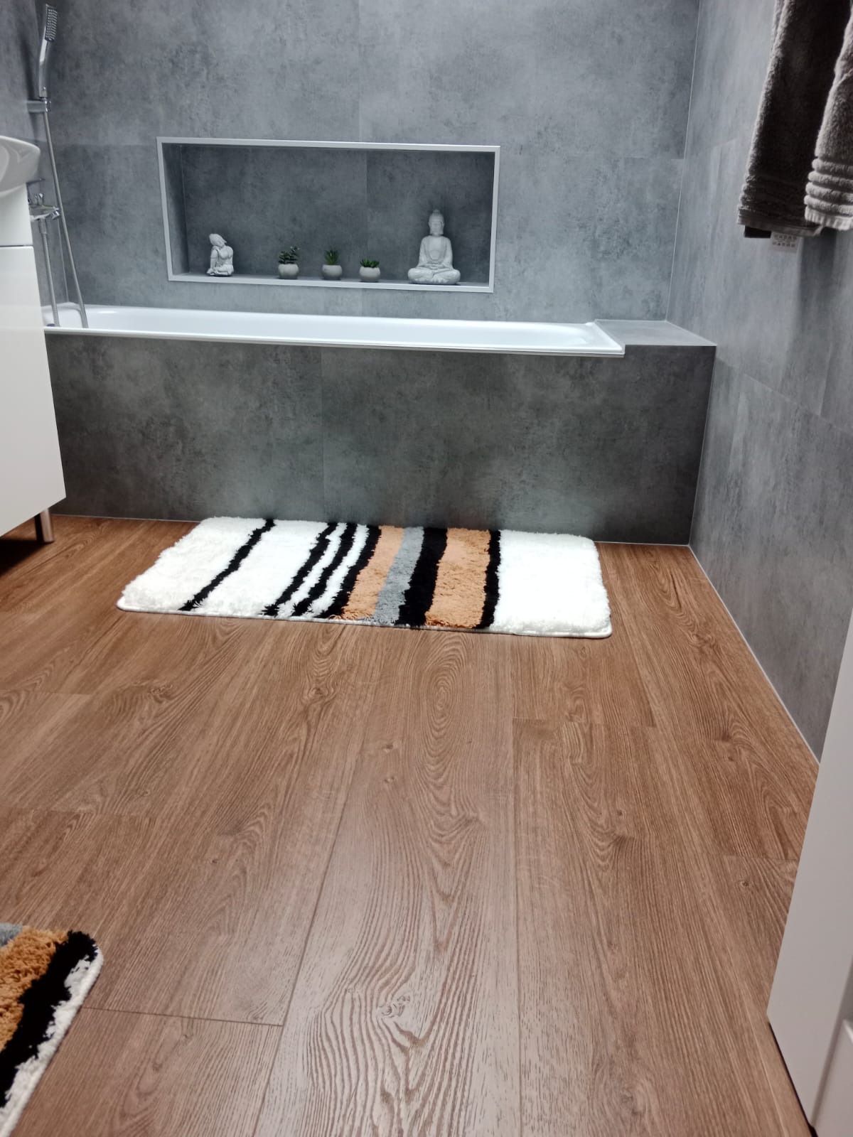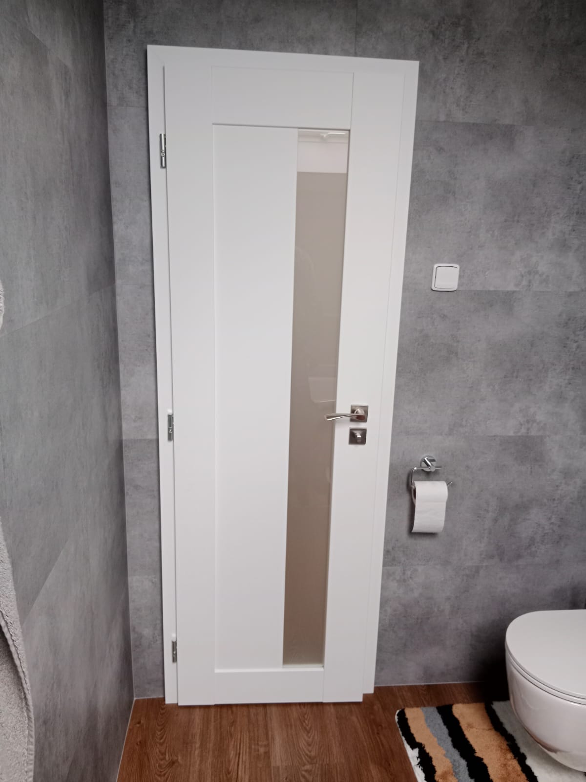 V rodinném domě v Ledči nad Sázavou jsme se podíleli na proměně designu celého domu, pomohli jsme s podlahami, obkladem schodiště i koupelny s toaletou do vinylu BUKOMA. Zákazník si vybral podlahu v dekoru BUKOMA PREMIUM U‑CLICK Dub Všechovický, který přináší autentickou kresbu dubu a odolný povrch pro každodenní provoz. Schodiště je realizováno se schody s nosem pro bezpečný došlap a čisté linie. Zakončení stěn zajišťují soklové lišty BUKOMA PROFI‑60 v přesném dekoru podlahy, díky čemuž je prostor vizuálně kompaktní a působí jednotně. Pro obklady zdí v koupelně a toaletě pak byla zvolena vinylová podlaha v dekoru BUKOMA STONE U-CLICK XL Beton Kámen Šedý