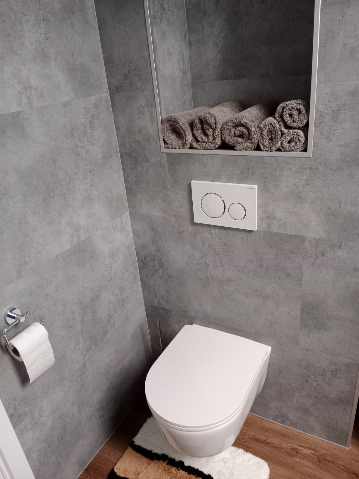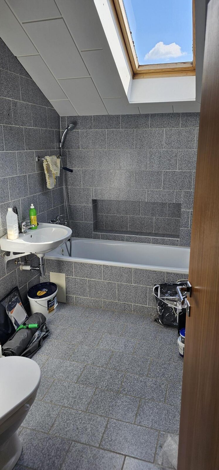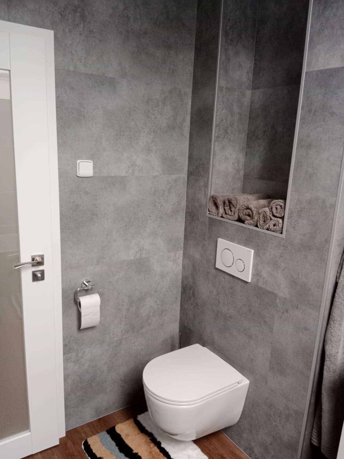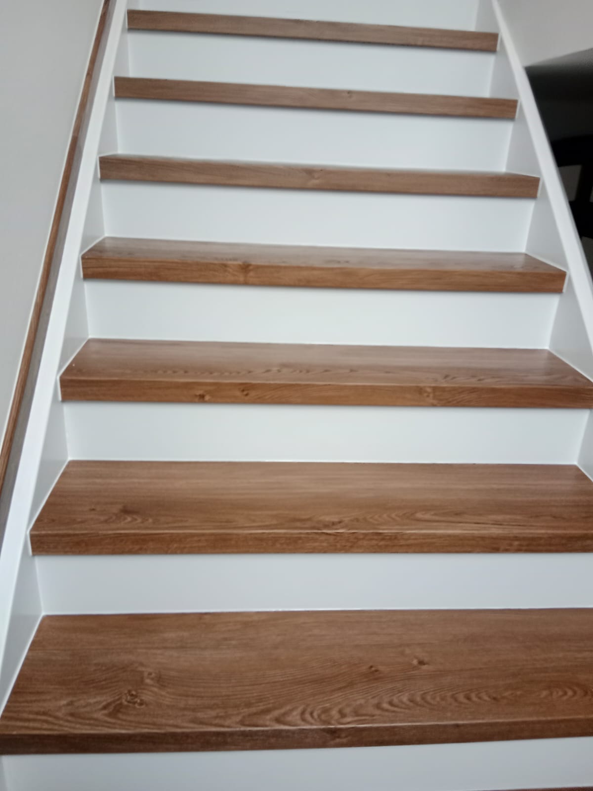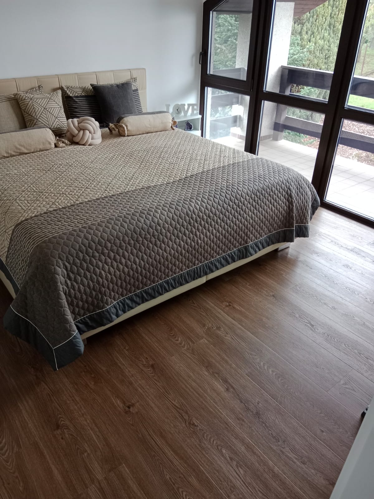 V rodinném domě v Ledči nad Sázavou jsme se podíleli na proměně designu celého domu, pomohli jsme s podlahami, obkladem schodiště i koupelny s toaletou do vinylu BUKOMA. Zákazník si vybral podlahu v dekoru BUKOMA PREMIUM U‑CLICK Dub Všechovický, který přináší autentickou kresbu dubu a odolný povrch pro každodenní provoz. Schodiště je realizováno se schody s nosem pro bezpečný došlap a čisté linie. Zakončení stěn zajišťují soklové lišty BUKOMA PROFI‑60 v přesném dekoru podlahy, díky čemuž je prostor vizuálně kompaktní a působí jednotně. Pro obklady zdí v koupelně a toaletě pak byla zvolena vinylová podlaha v dekoru BUKOMA STONE U-CLICK XL Beton Kámen Šedý