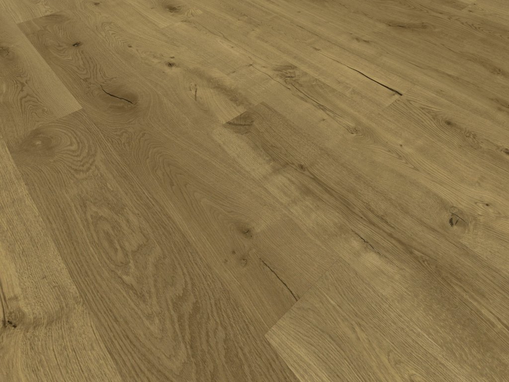 Teplejší, medově hnědý odstín s rustikální kresbou a jemnými přechody. Matný finiš a 3D embos vytvářejí autentický dojem masivního dubu.