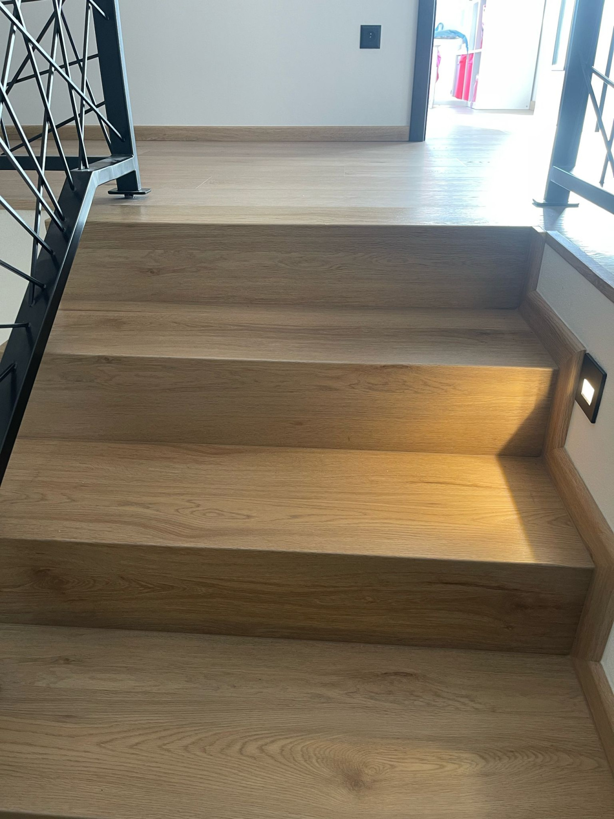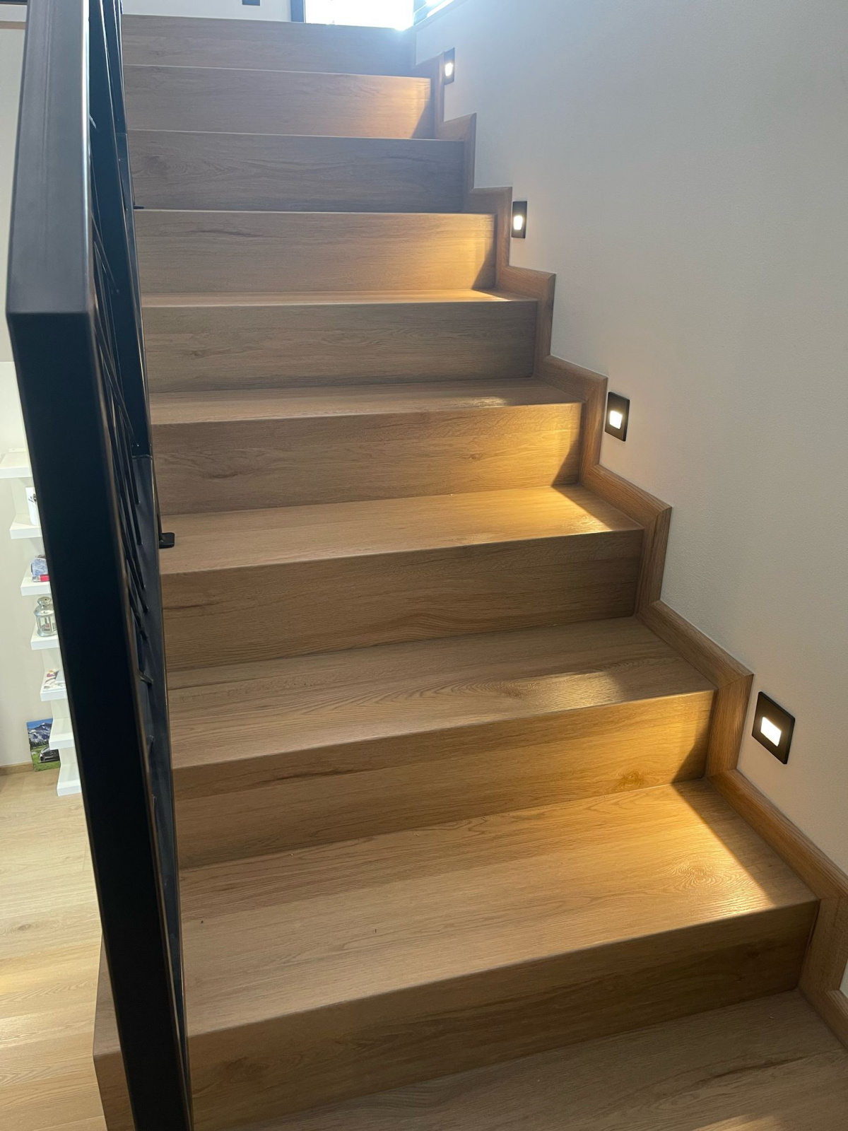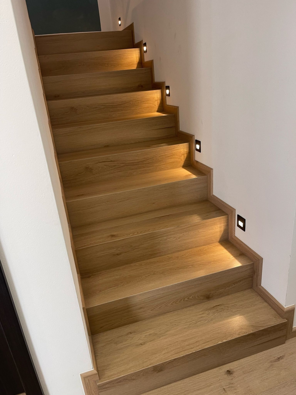 Součástí této realizace byl také obklad betonového monolitického schodiště stejným dekorem vinylu, konkrétně BUKOMA 3D TEX U-CLICK Dub Natur. Na přání zákazníka bylo schodiště provedeno bez nosu, což dodalo schodům minimalistický a elegantní vzhled. Precizně provedené ohyby zajišťují dokonalý vizuální dojem a zároveň maximální bezpečnost při používání schodiště.