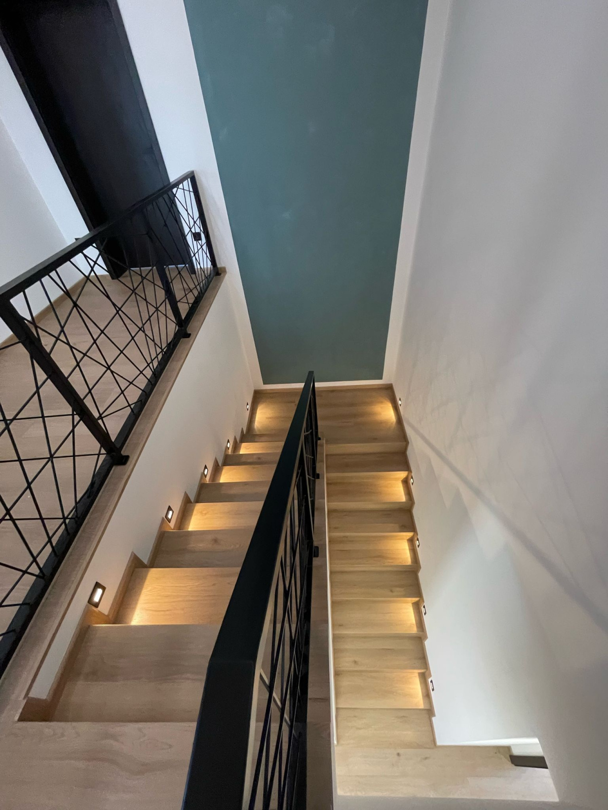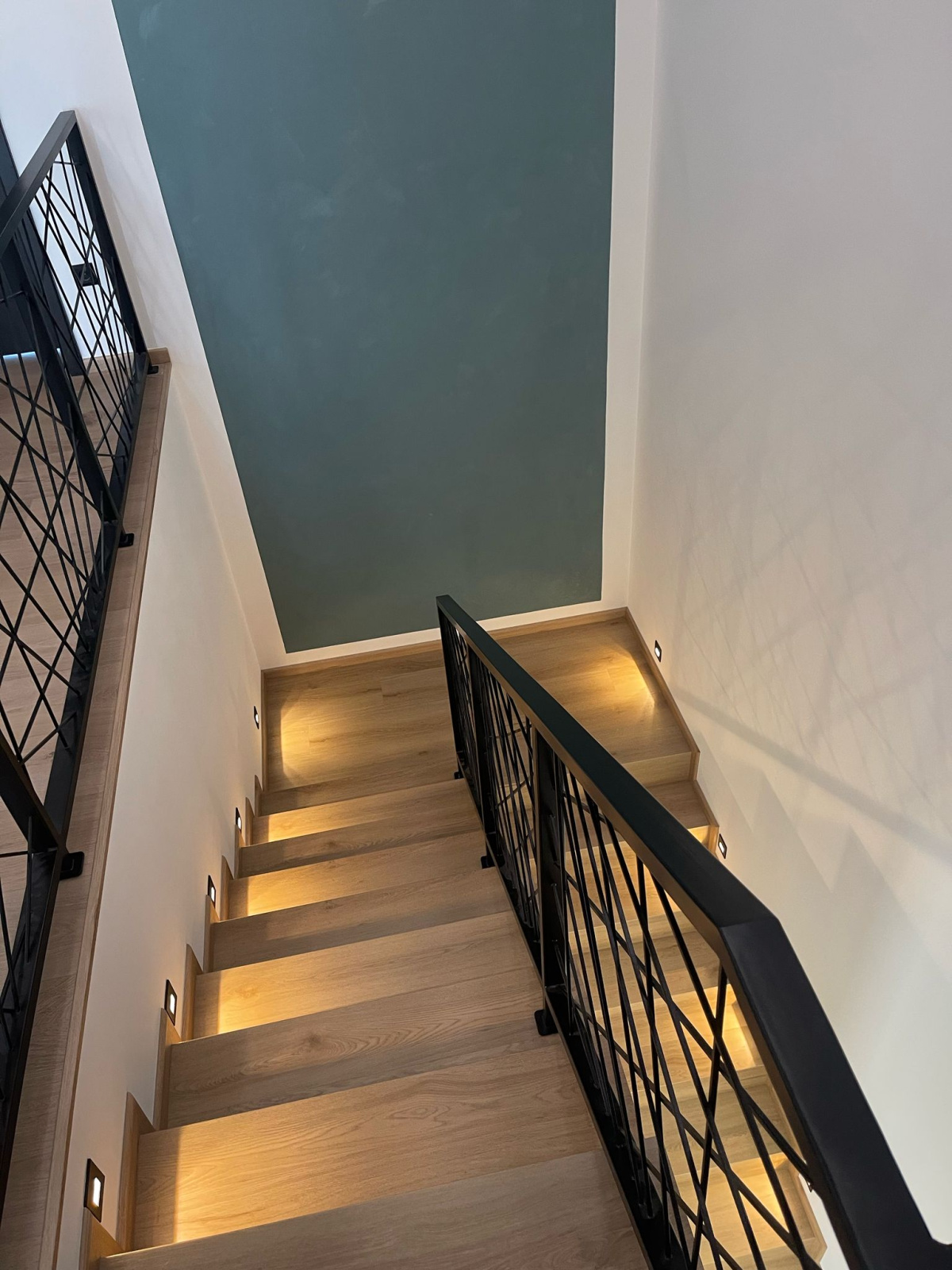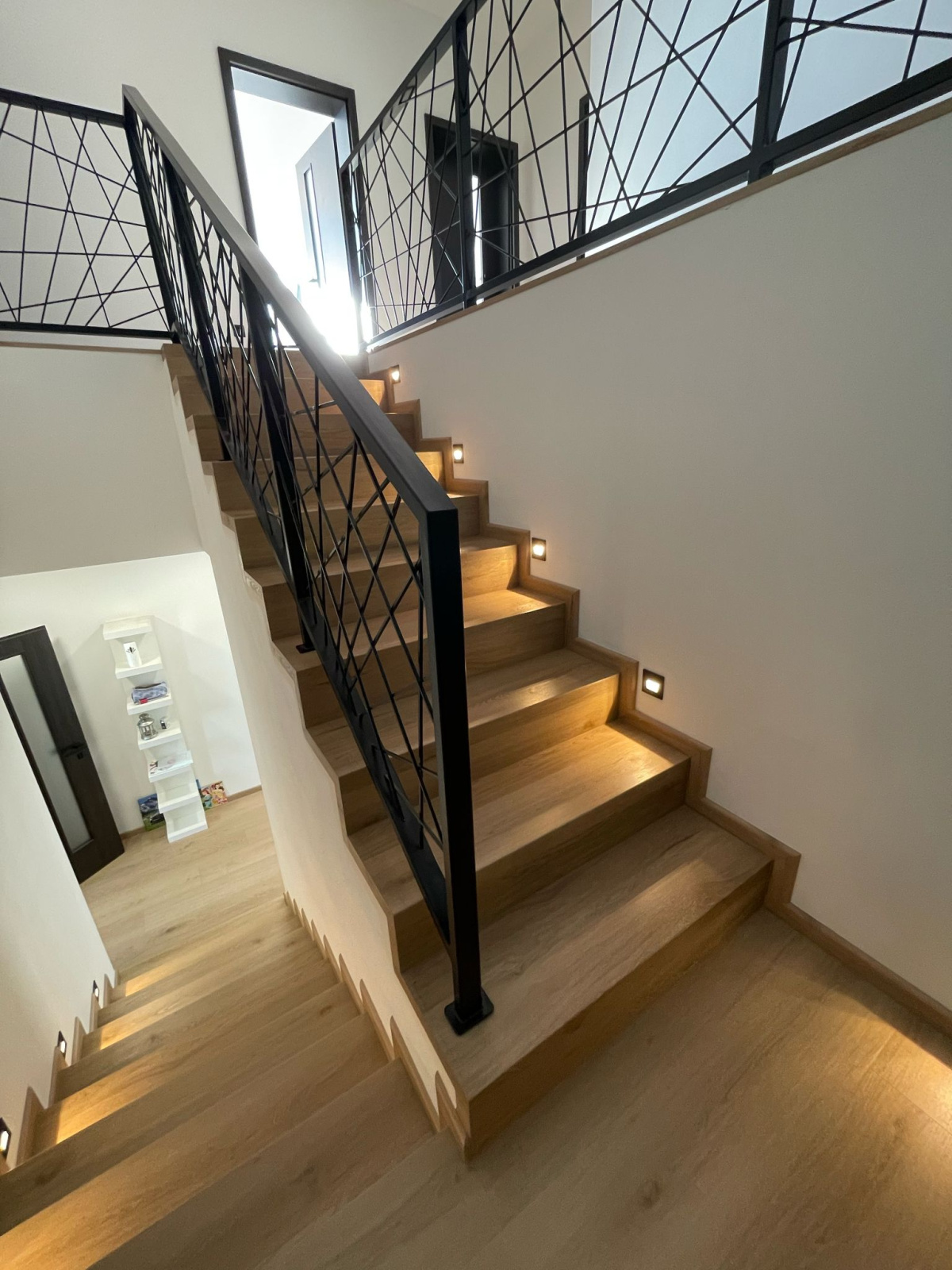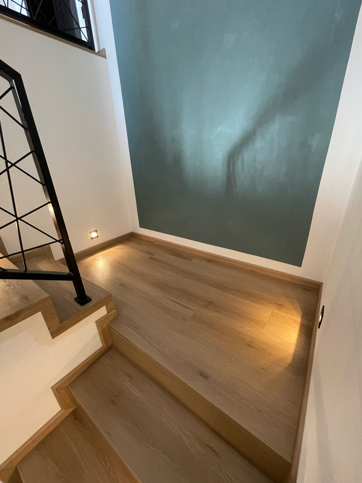 Součástí této realizace byl také obklad betonového monolitického schodiště stejným dekorem vinylu, konkrétně BUKOMA 3D TEX U-CLICK Dub Natur. Na přání zákazníka bylo schodiště provedeno bez nosu, což dodalo schodům minimalistický a elegantní vzhled. Precizně provedené ohyby zajišťují dokonalý vizuální dojem a zároveň maximální bezpečnost při používání schodiště.