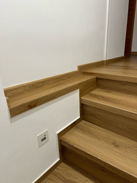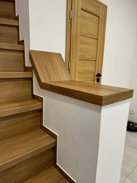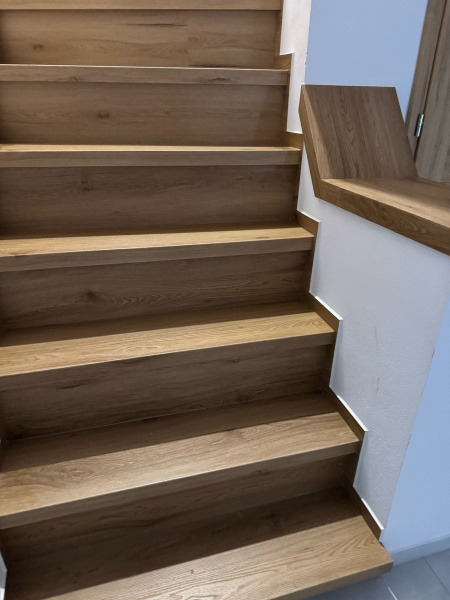 Dekor Dub Bunbury dodává schodům přírodní a příjemný vzhled, který krásně ladí s celkovým stylem interiéru. Nos schodů přispívá k bezpečnosti a vytváří elegantní a profesionální vzhled schodiště. Součástí obkladu bylo i obložení zídky zábradlí, které celkovému prostoru dodává soudržný a jednotný vzhled bez viditelných přechodů. Použitý vinylový materiál BUKOMA PREMIUM U-CLICK je známý pro svou odolnost, snadnou údržbu a voděodolné vlastnosti, což z něj činí ideální volbu pro rekonstrukci schodišť.