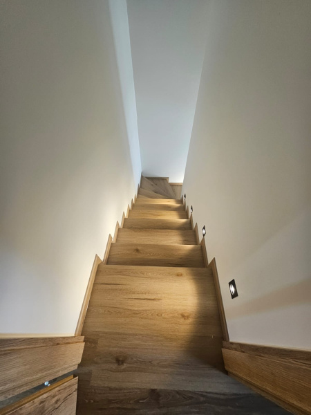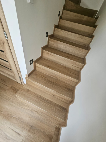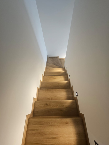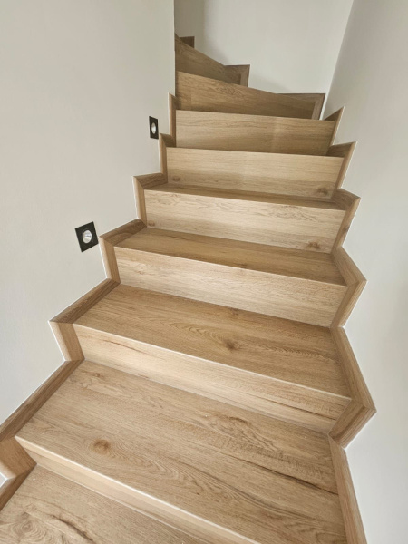 Soklové zapravení bylo provedeno pomocí lišt BUKOMA PROFI 60, které dokonale ladí s dekorem podlahy. Díky tomu schodiště působí jednotně a esteticky sladěně, bez zbytečných přechodů a narušení designu. Lišty BUKOMA PROFI 60 jsou navrženy tak, aby dokonale kopírovaly odstín i texturu podlahového dekoru, což zajišťuje harmonický vzhled celého prostoru.