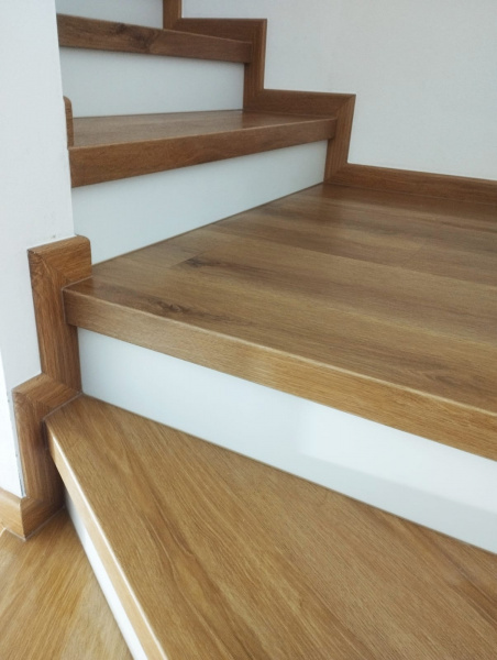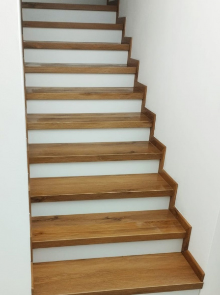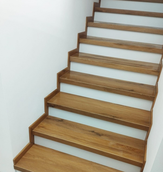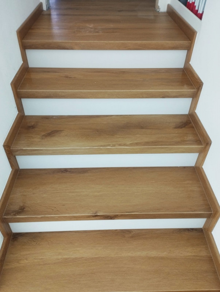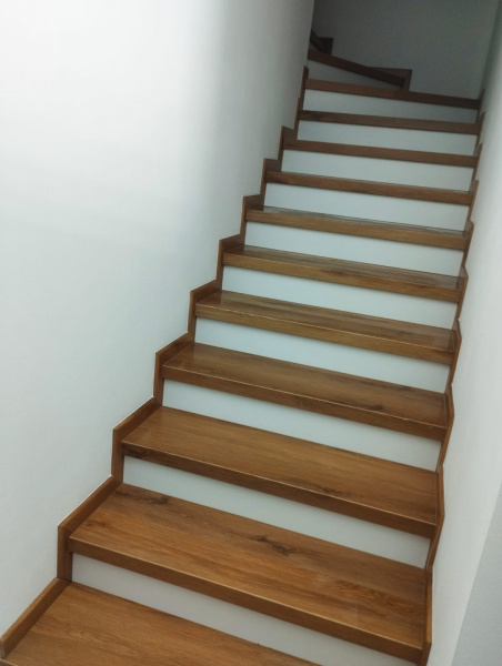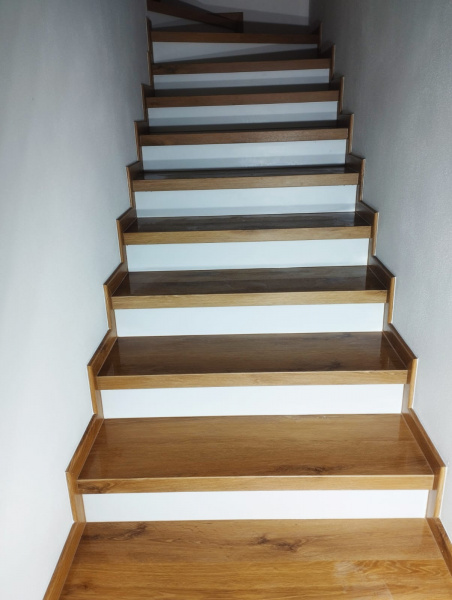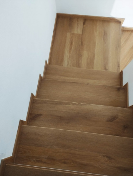 Další ukázka práce podlahářů z Bukomy, obklad schodiště vinylovou podlahou BUKOMA CLICK Dub Kanadský, varianta schodů s nosem a bílou podstupnicí. Bílé podstupnice jsou vyrobeny z bíloho vinylu Bukoma (tento materiál nemáme v nabídce k prodeji, používáme ho jen pro naše instalace). Soklové zapravení je provedeno pomocí lišt BUKOMA PROFI 60 s přesným dekorem podlahy Dub Kanadský.