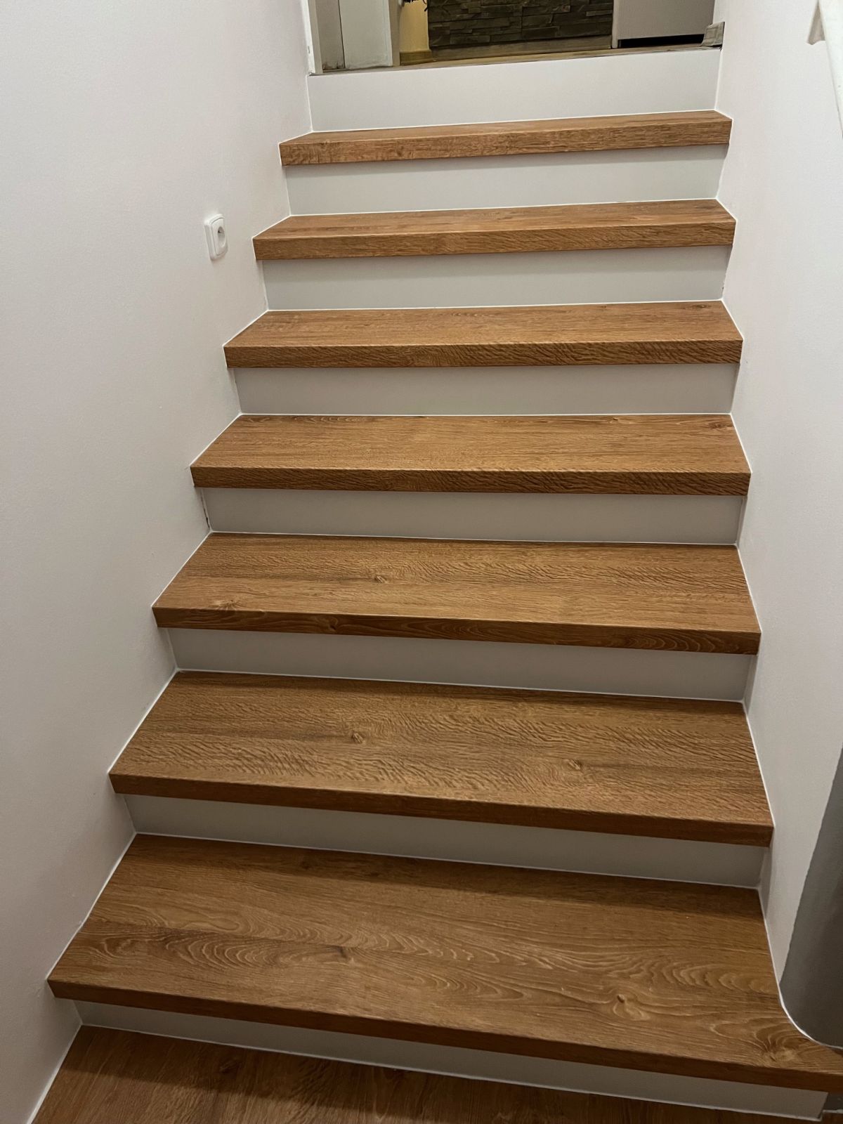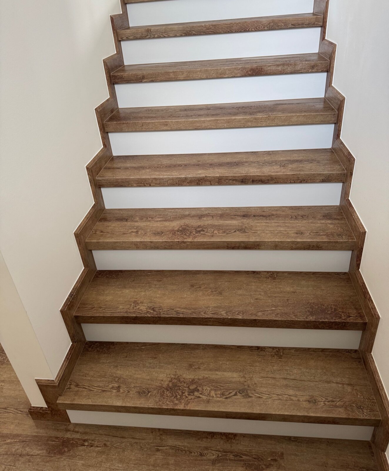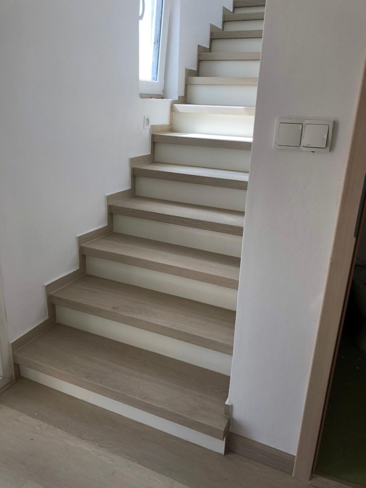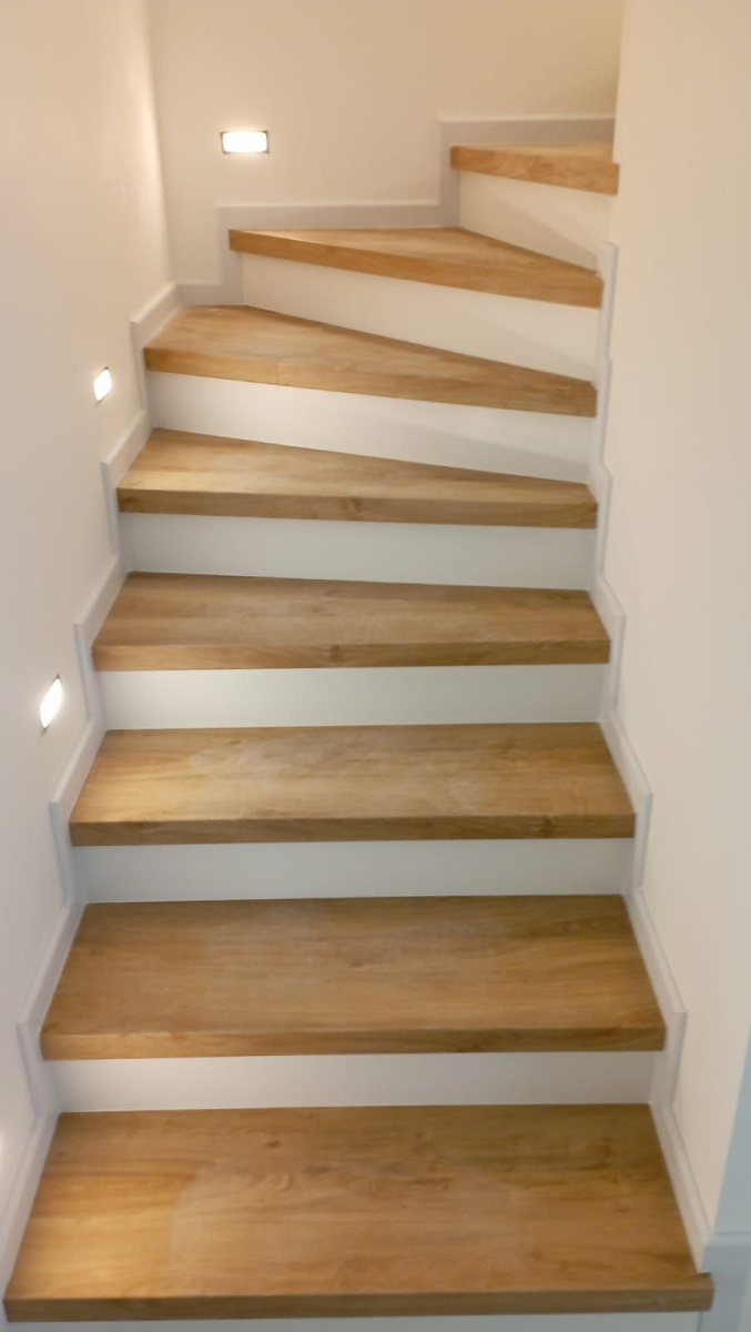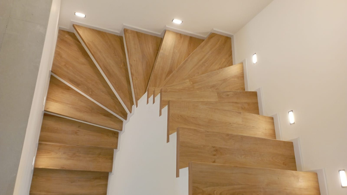 Prinášame ukážky obkladov schodísk z vinylových podláh s ohybmi, spracované technológiou BUKOMA®. Táto rubrika ukazuje variant schodov s nosom a bielou podstupnicou – riešenie, ktoré pôsobí elegantne, svetlo a zvýrazňuje čisté línie schodiska.