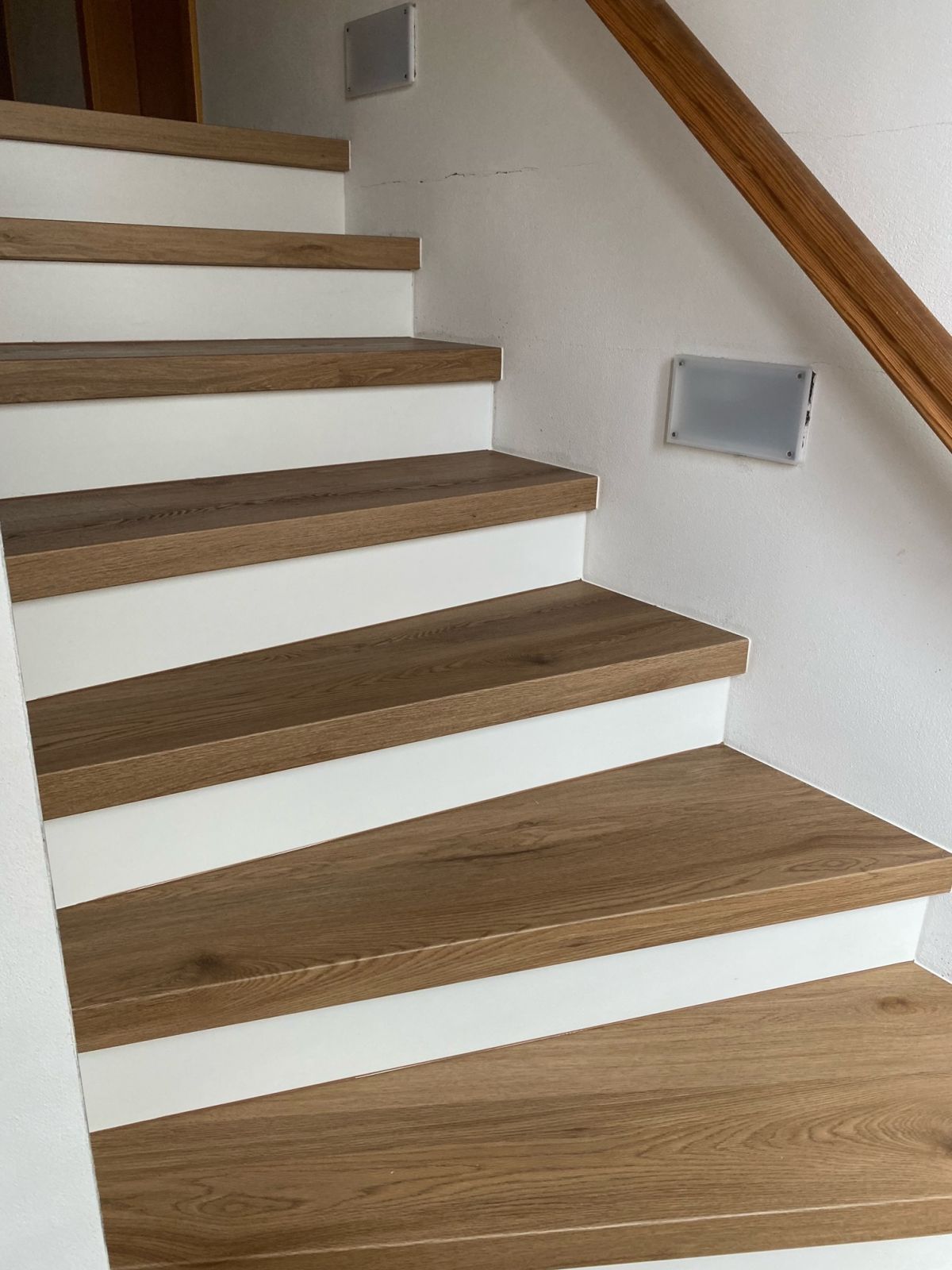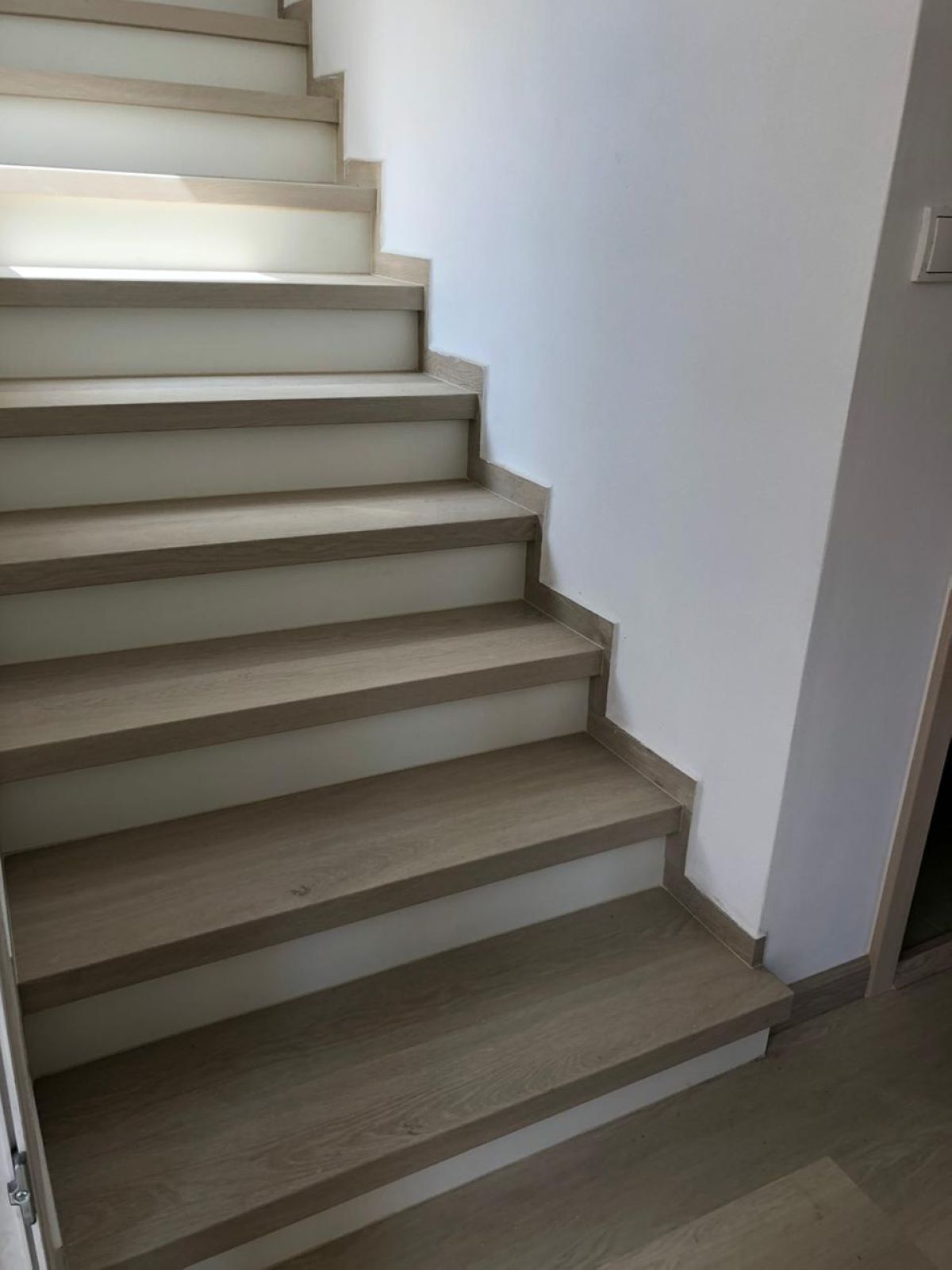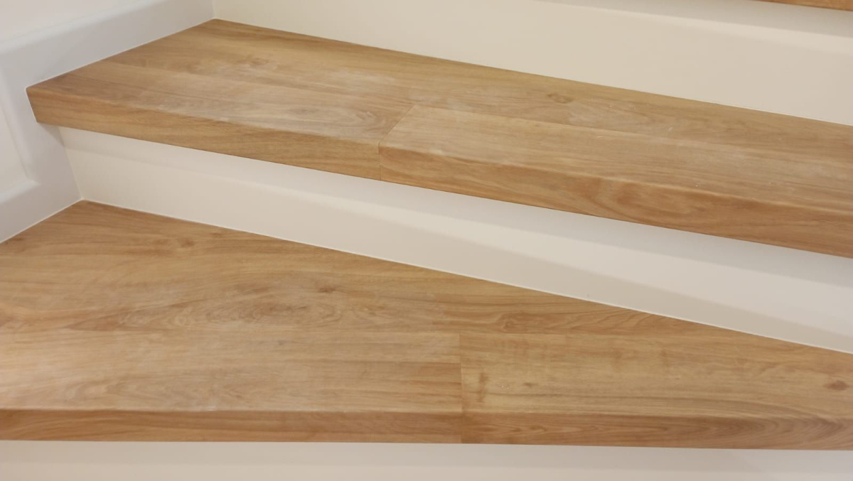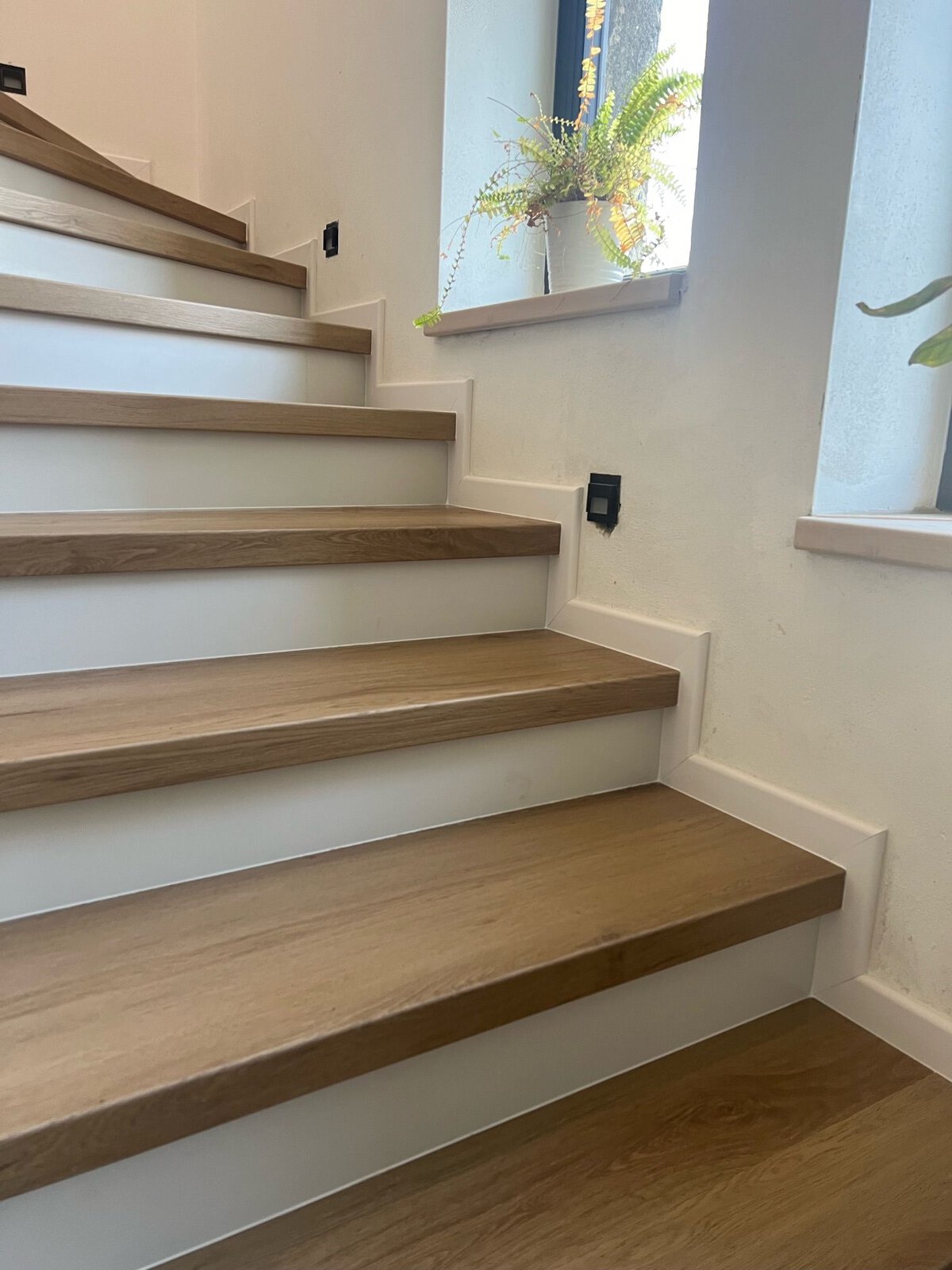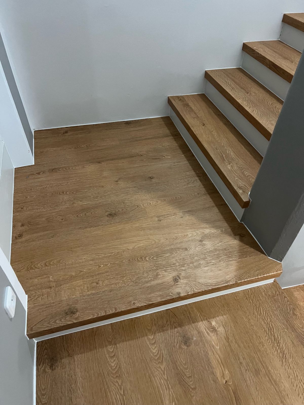 Prinášame ukážky obkladov schodísk z vinylových podláh s ohybmi, spracované technológiou BUKOMA®. Táto rubrika ukazuje variant schodov s nosom a bielou podstupnicou – riešenie, ktoré pôsobí elegantne, svetlo a zvýrazňuje čisté línie schodiska.