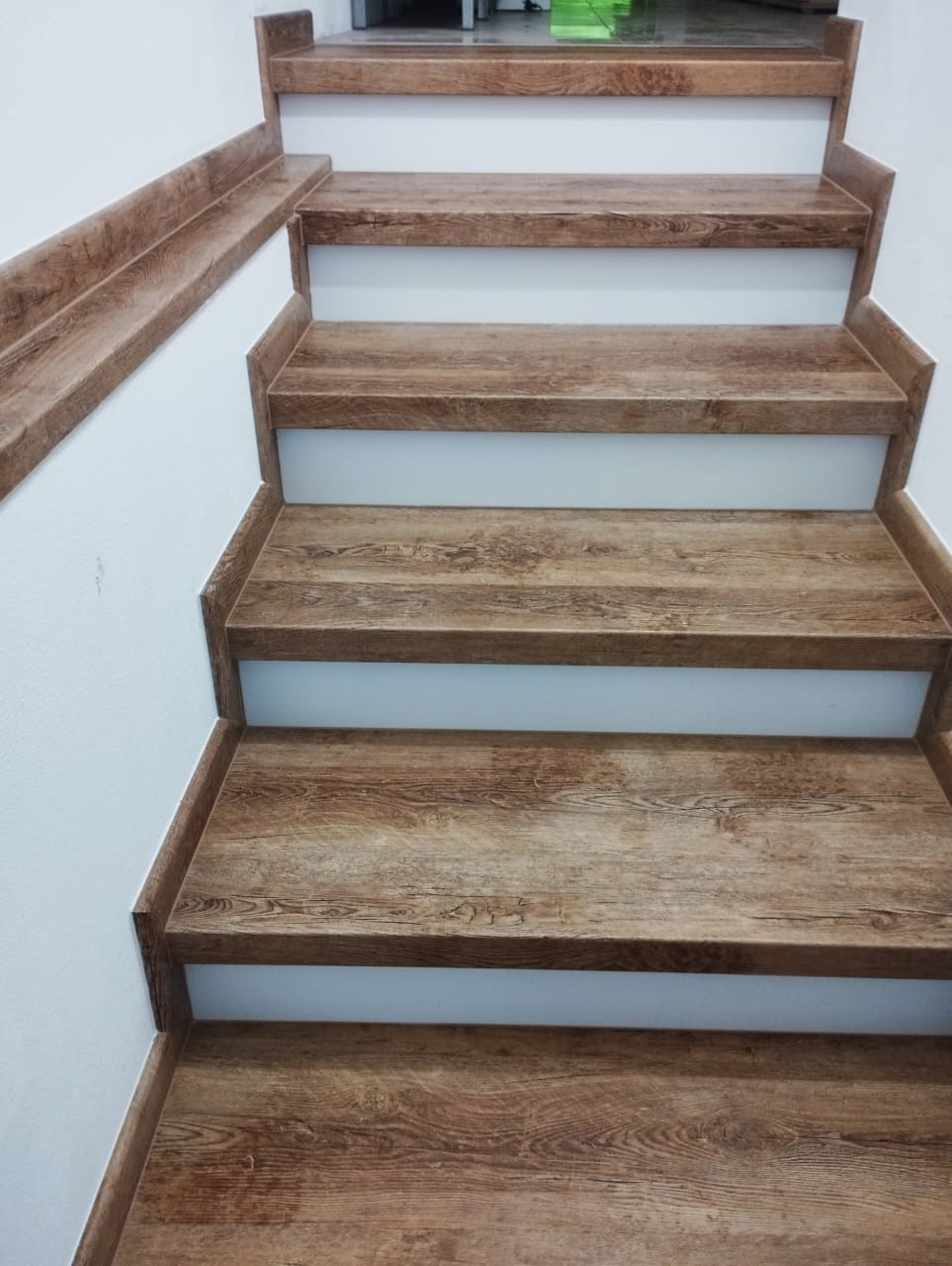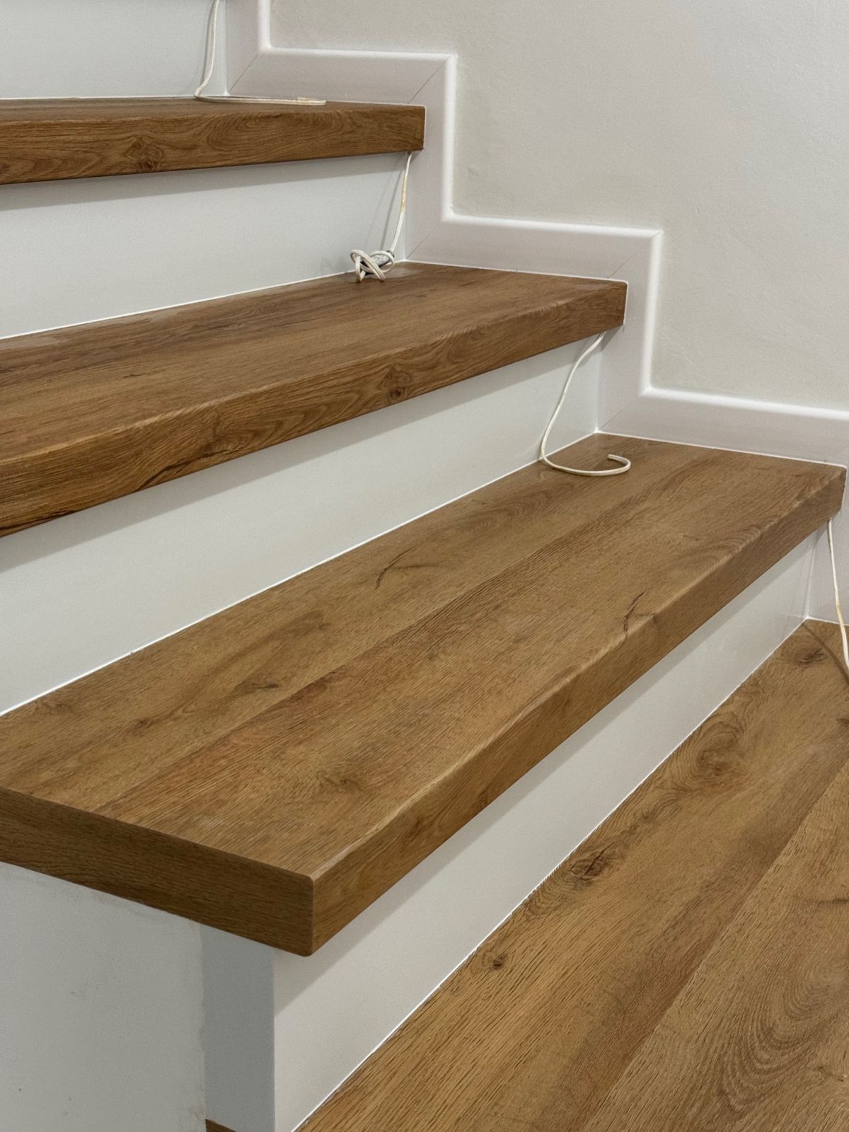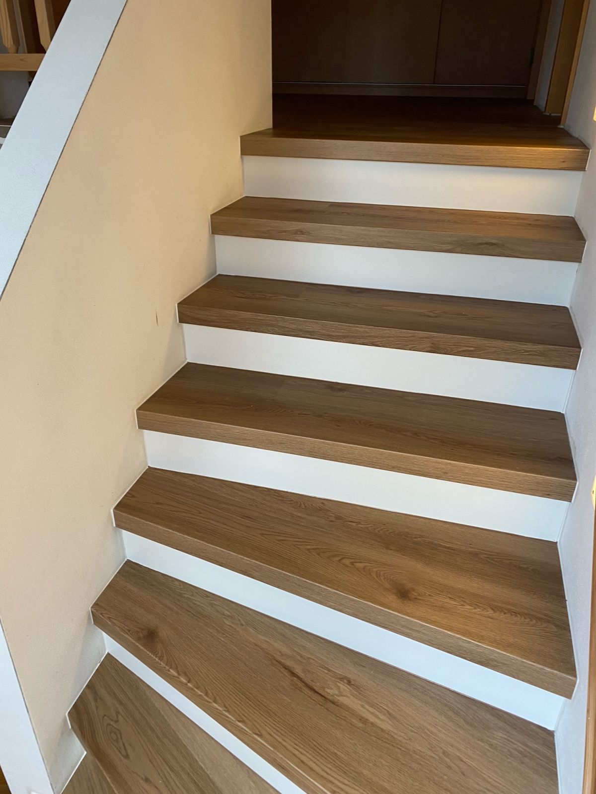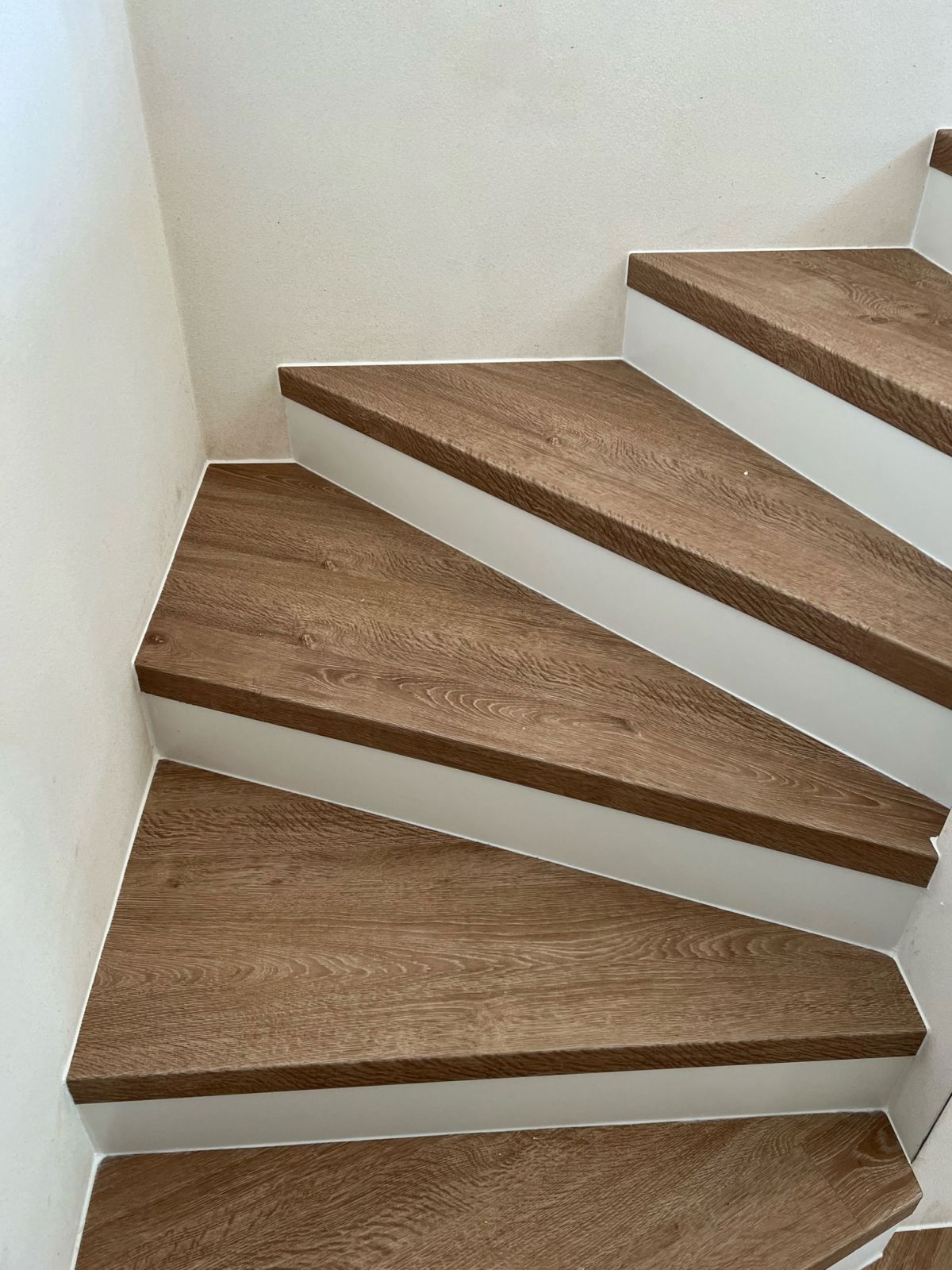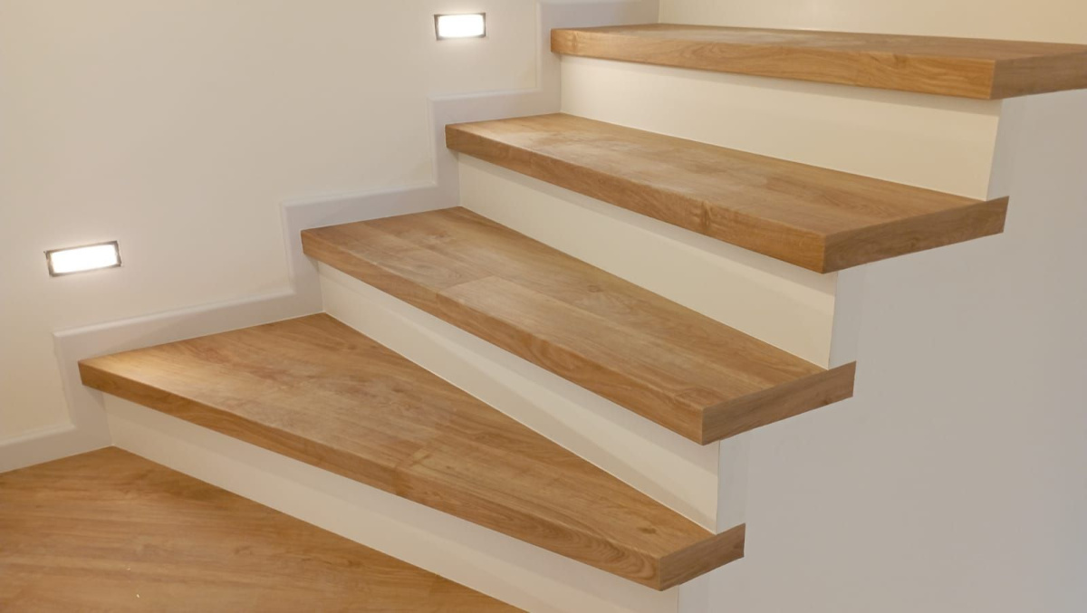 Prinášame ukážky obkladov schodísk z vinylových podláh s ohybmi, spracované technológiou BUKOMA®. Táto rubrika ukazuje variant schodov s nosom a bielou podstupnicou – riešenie, ktoré pôsobí elegantne, svetlo a zvýrazňuje čisté línie schodiska.