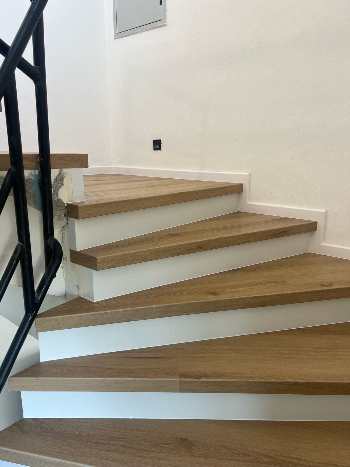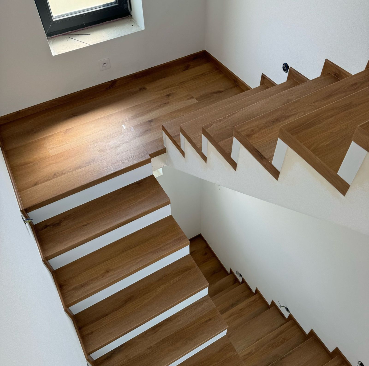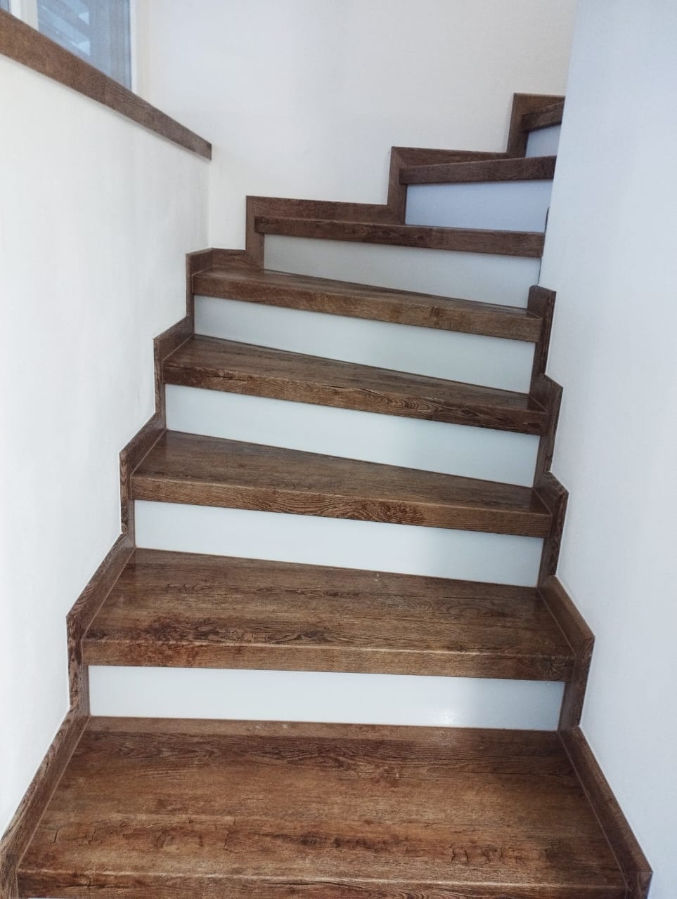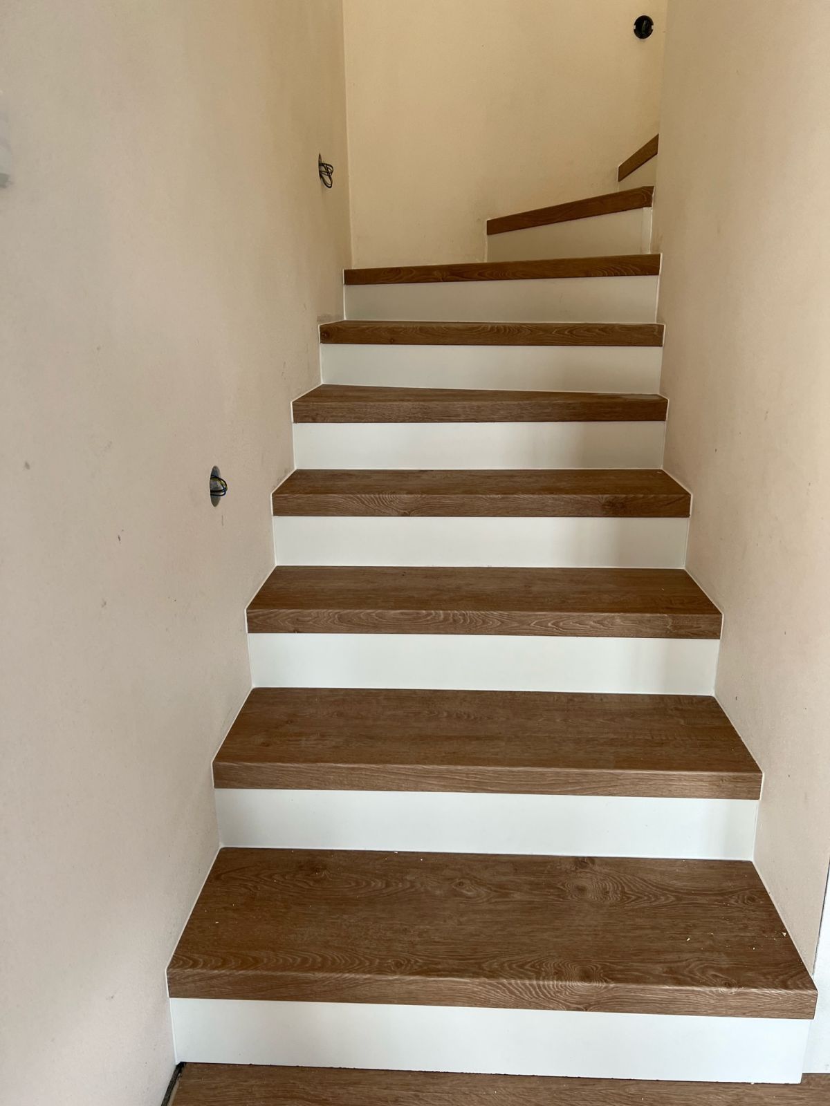 Prinášame ukážky obkladov schodísk z vinylových podláh s ohybmi, spracované technológiou BUKOMA®. Táto rubrika ukazuje variant schodov s nosom a bielou podstupnicou – riešenie, ktoré pôsobí elegantne, svetlo a zvýrazňuje čisté línie schodiska.