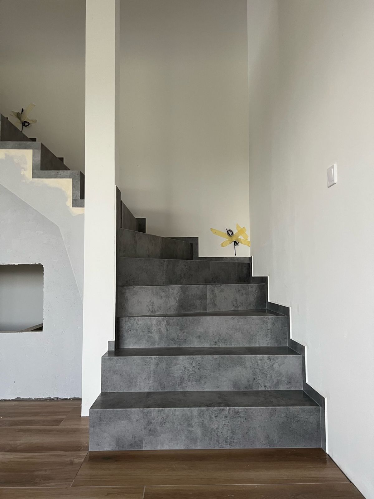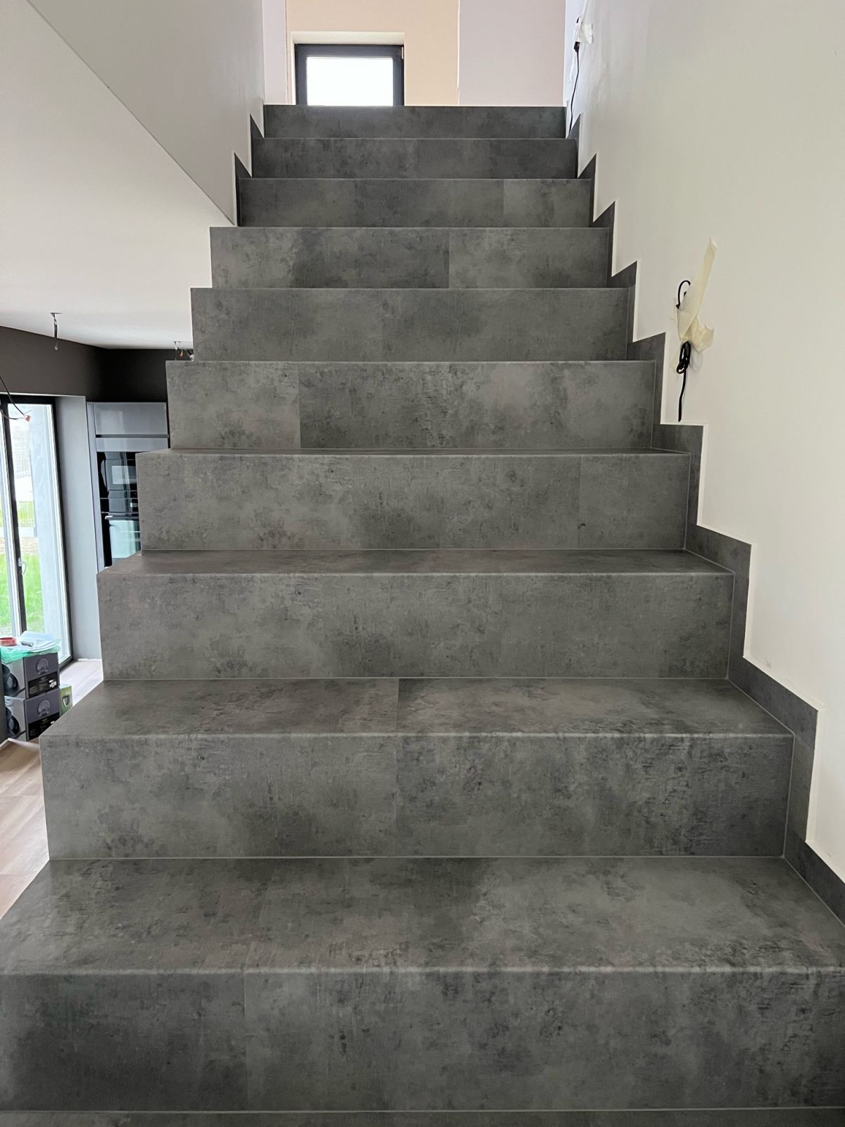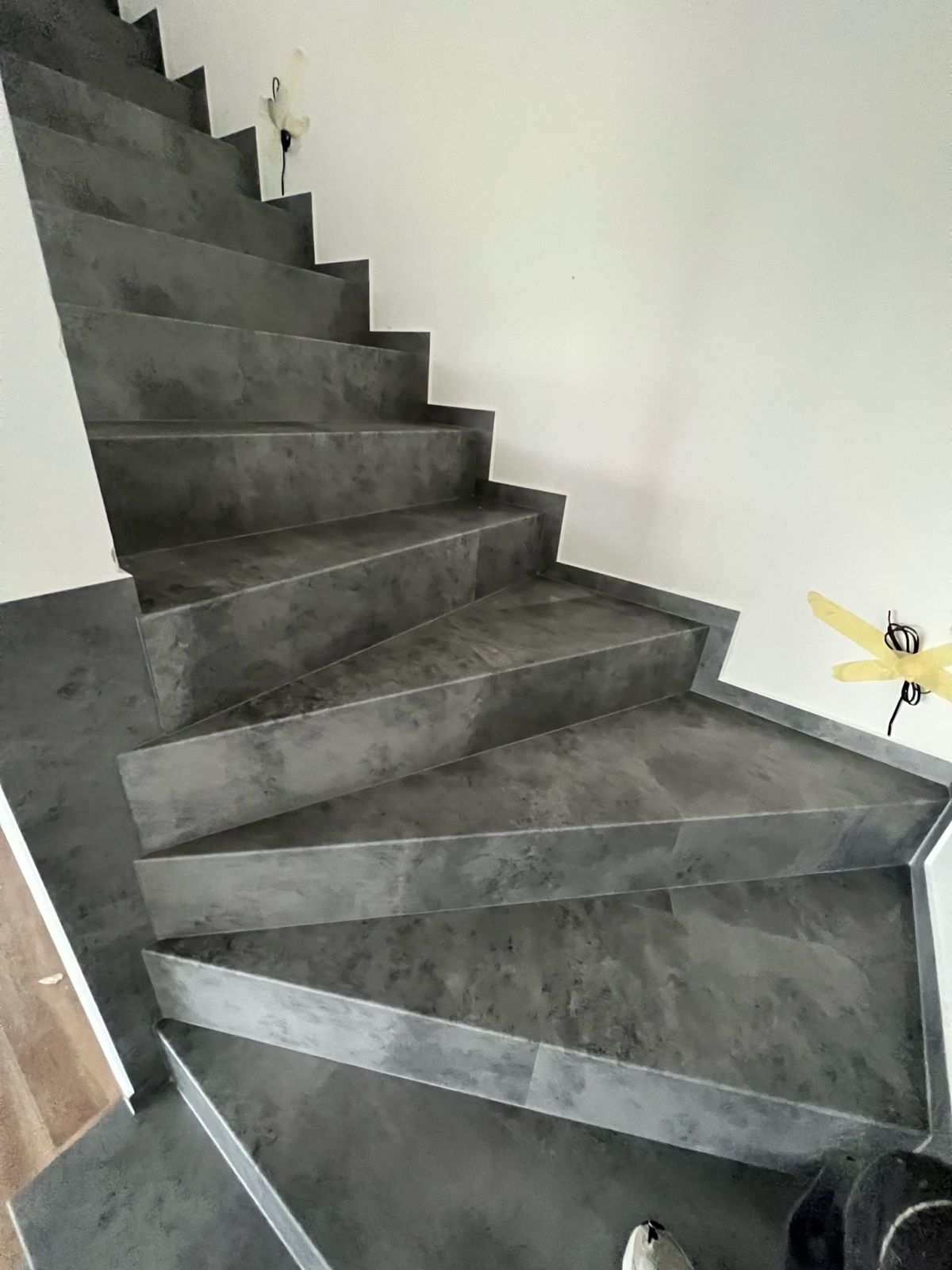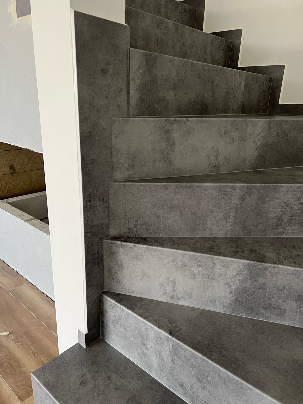 Ukázka práce podlahářů z Bukoma, obklad schodiště vinylovou podlahou s dekorem kamene BUKOMA STONE U-CLICK XL Beton kámen šedý, varianta schodů bez nosu, podklad betonový monolit.