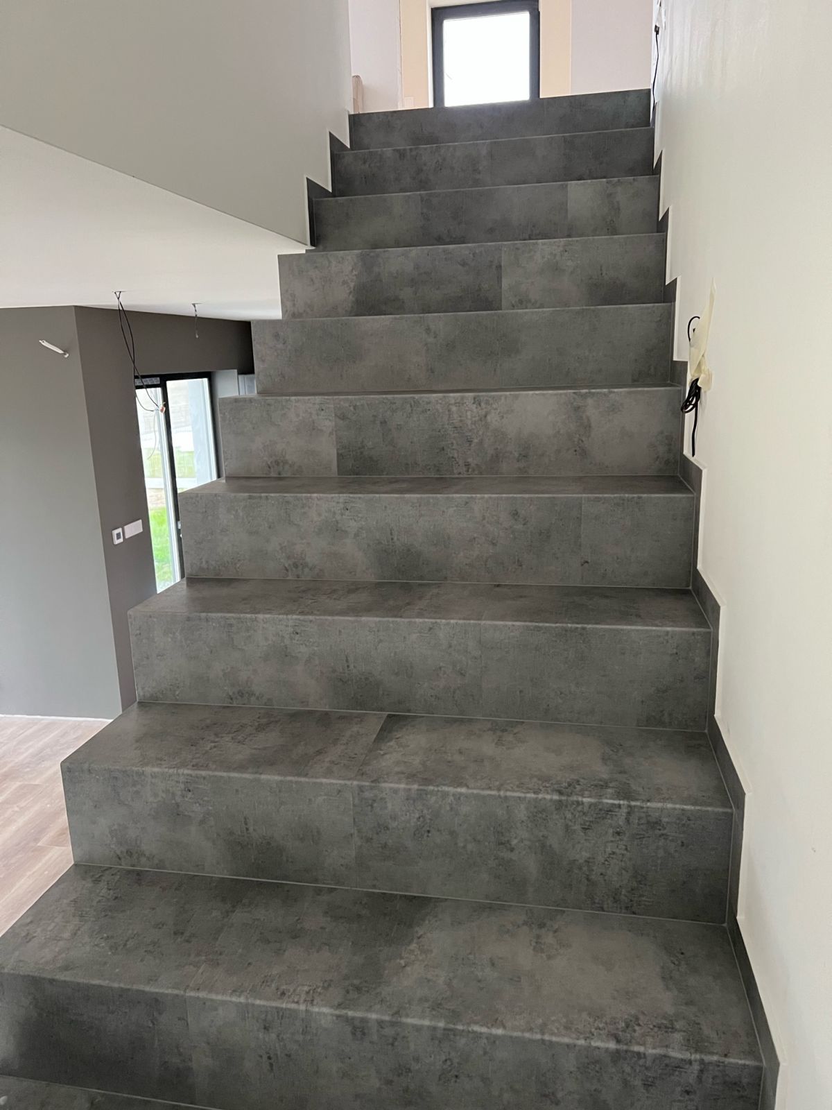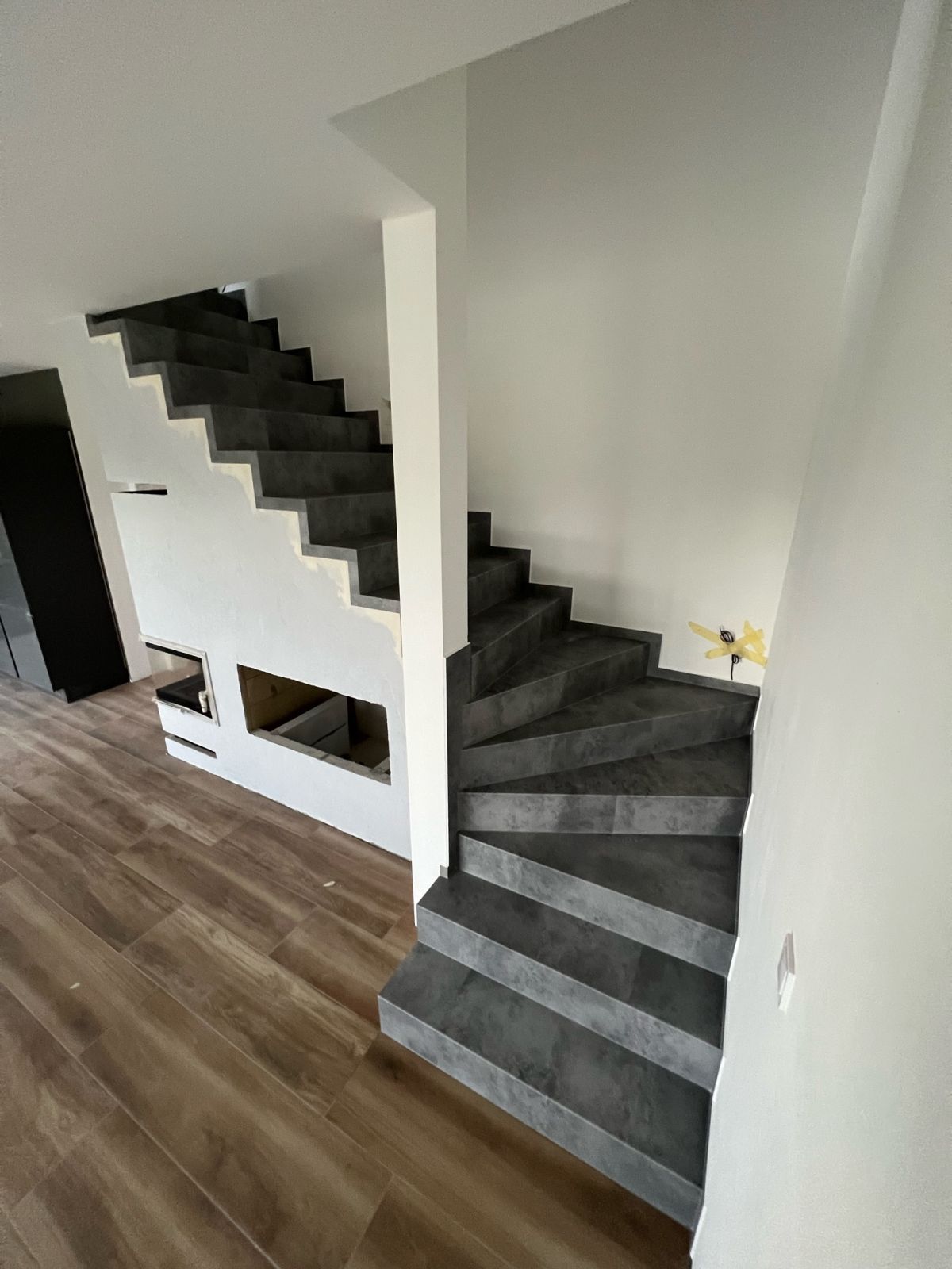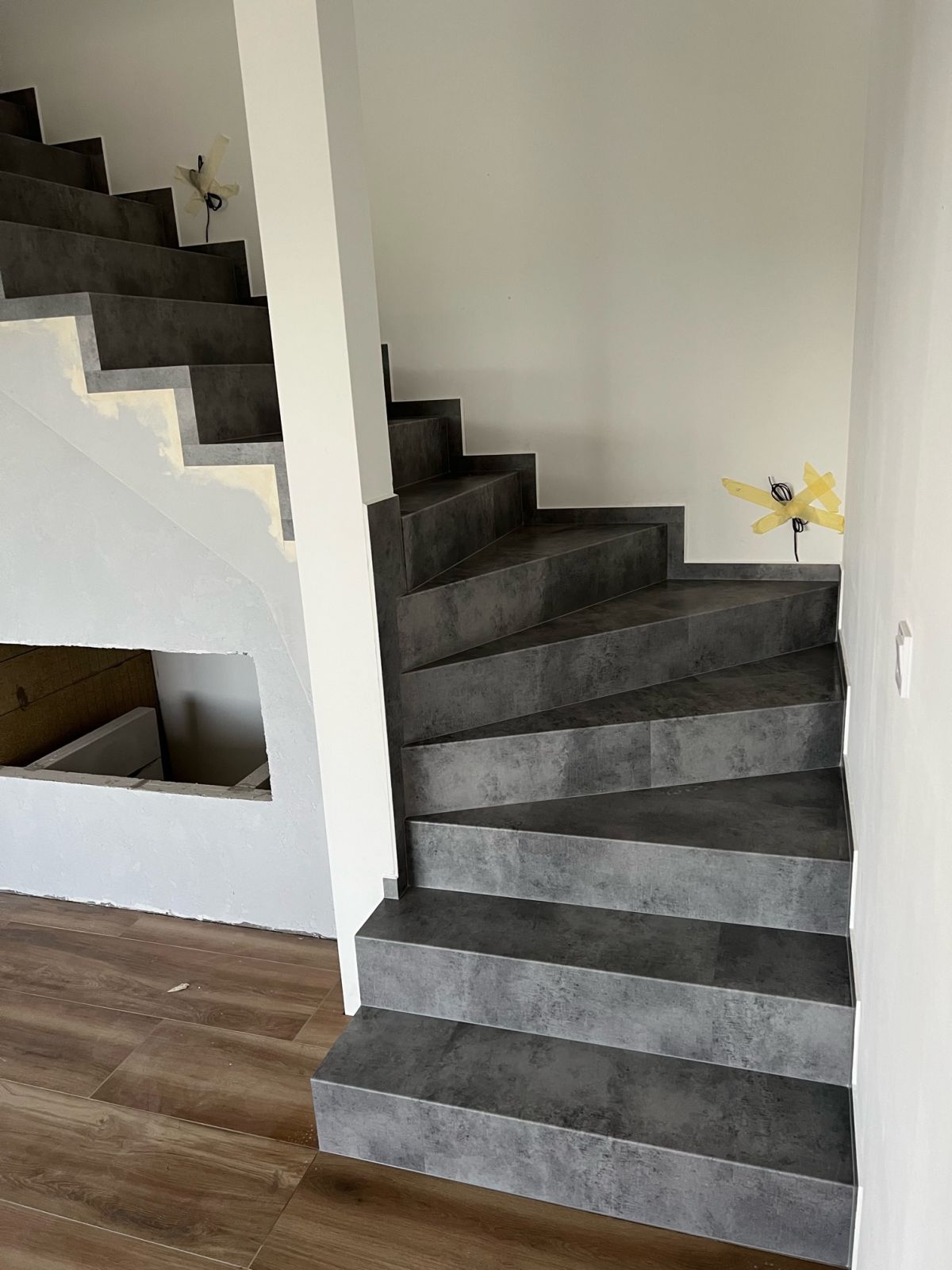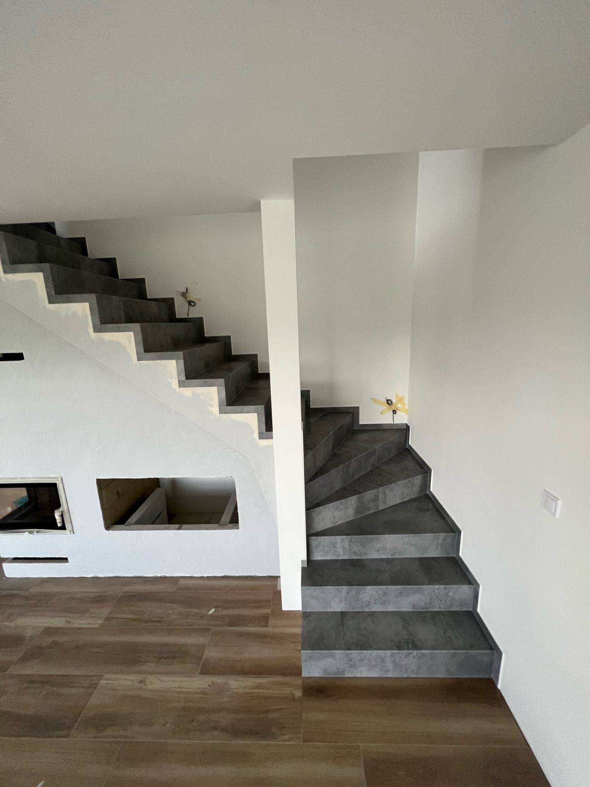 Ukázka práce podlahářů z Bukoma, obklad schodiště vinylovou podlahou s dekorem kamene BUKOMA STONE U-CLICK XL Beton kámen šedý, varianta schodů bez nosu, podklad betonový monolit.