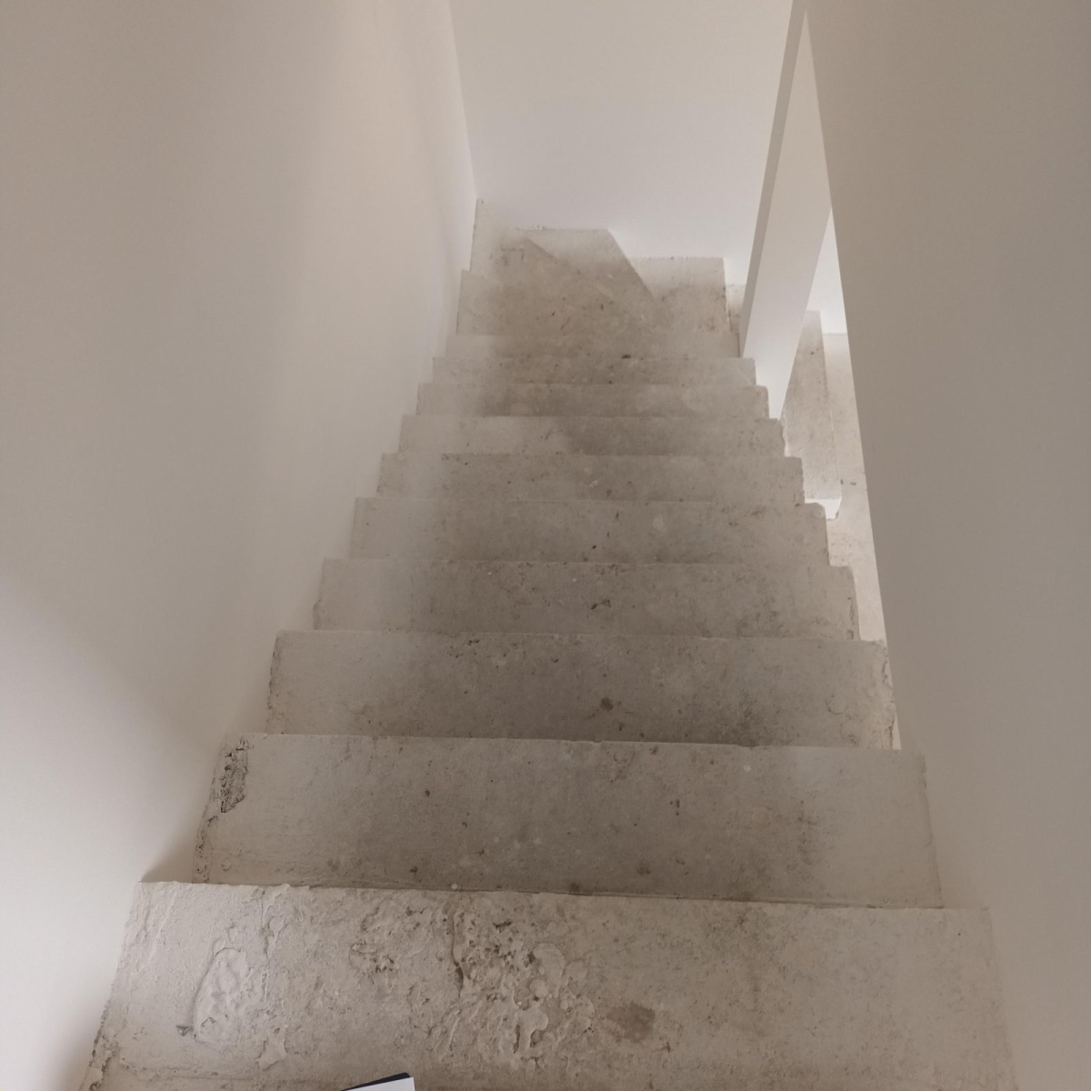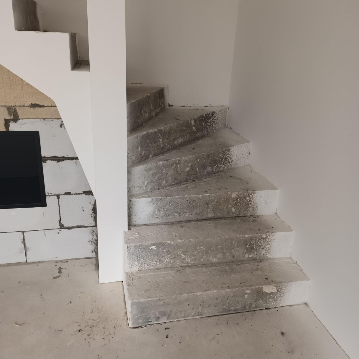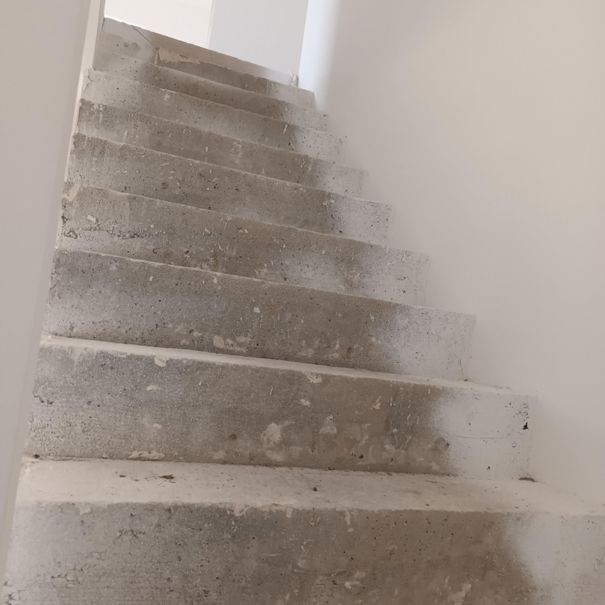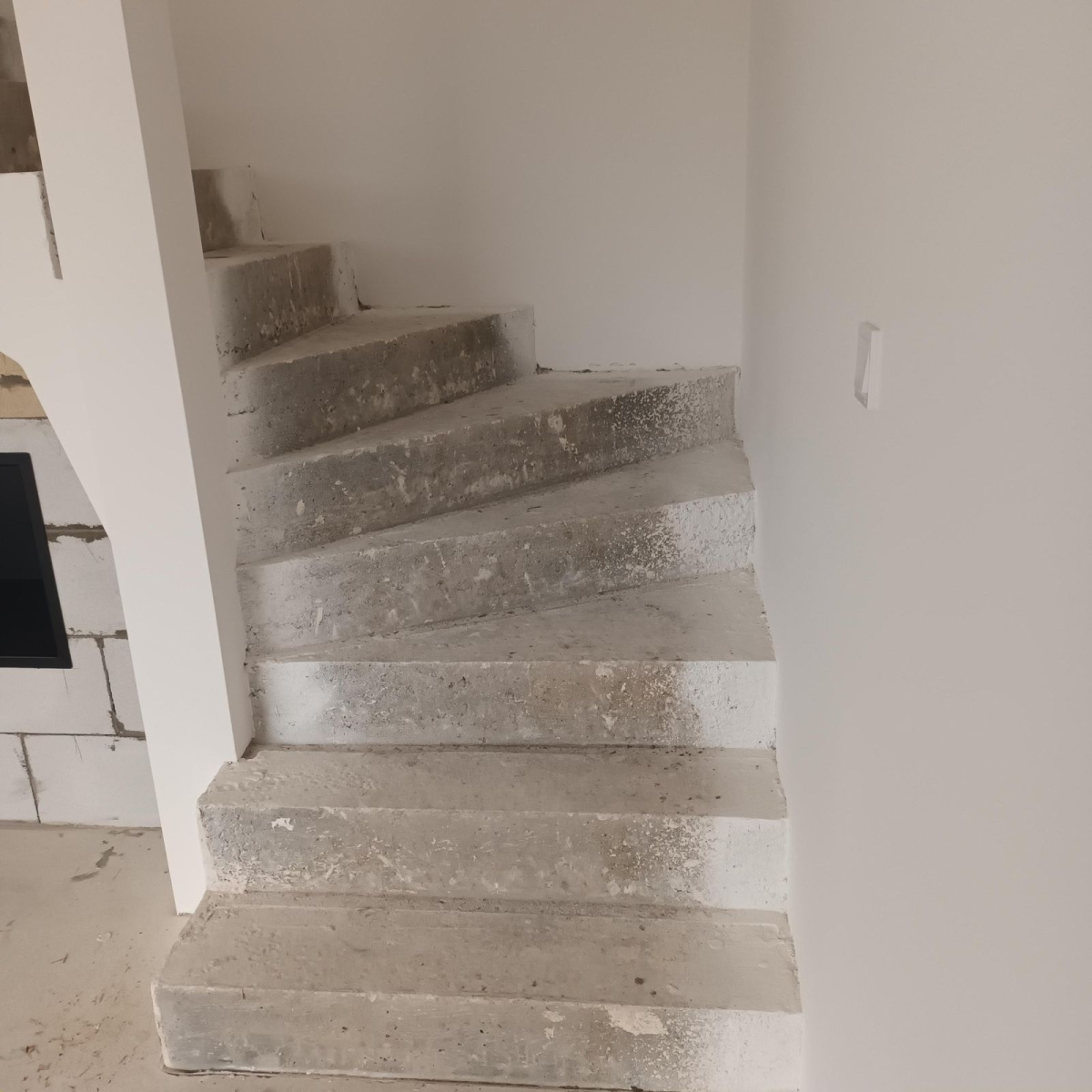 Ukázka práce podlahářů z Bukoma, obklad schodiště vinylovou podlahou s dekorem kamene BUKOMA STONE U-CLICK XL Beton kámen šedý, varianta schodů bez nosu, podklad betonový monolit.