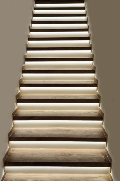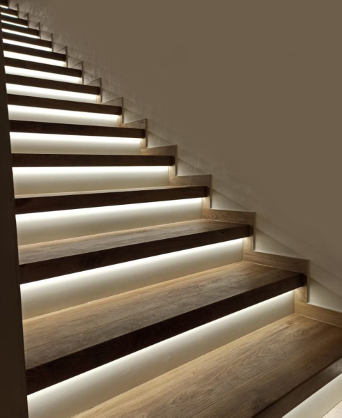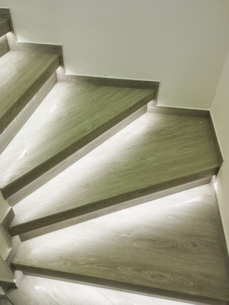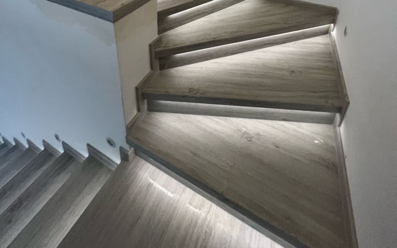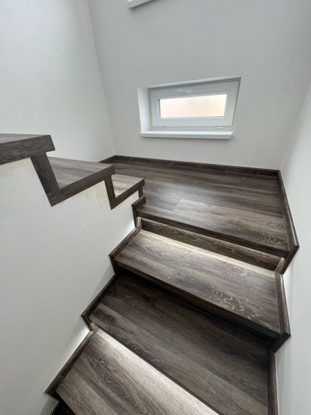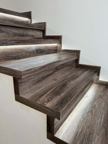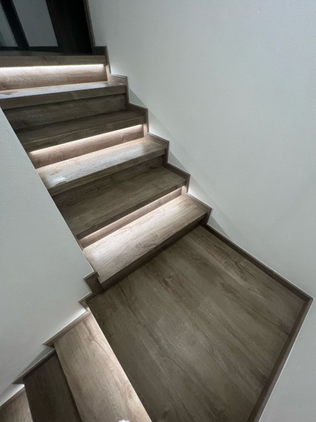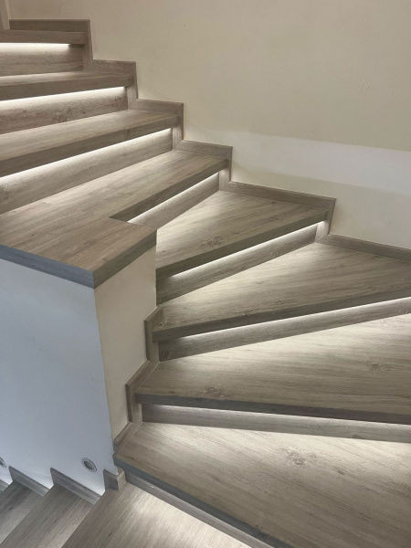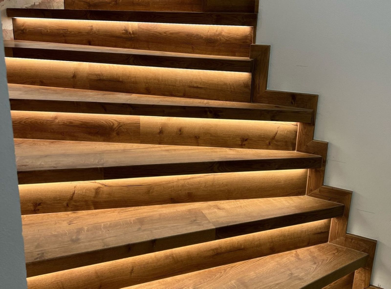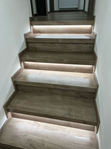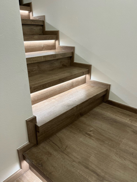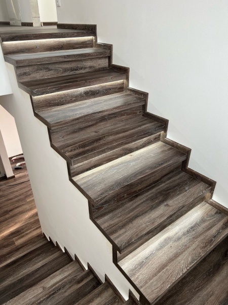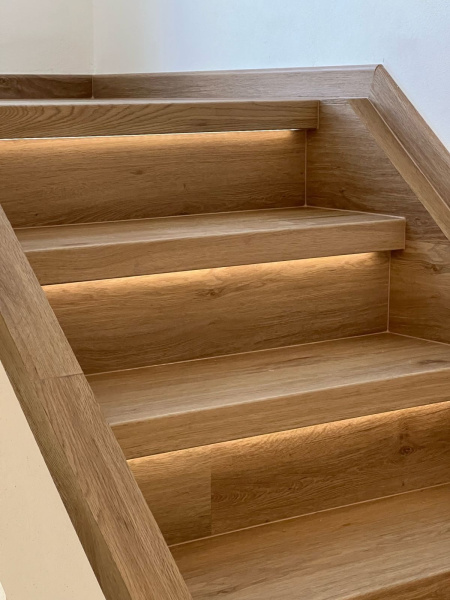 V tejto galérii vám predstavujeme ukážky obkladov schodov z vinylových podláh, spracované technológiou BUKOMA®, doplnené o LED osvetlenie schodového nosa. LED podsvietenie zvýrazňuje hrany schodov, zlepšuje orientáciu v priestore a zároveň dodáva schodisku moderný a elegantný vzhľad.